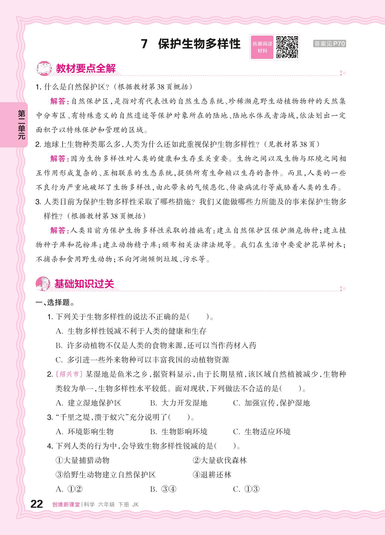 2024春下册六年级科学教科版 第二单元 生物的多样性——7. 保护生物多样性
