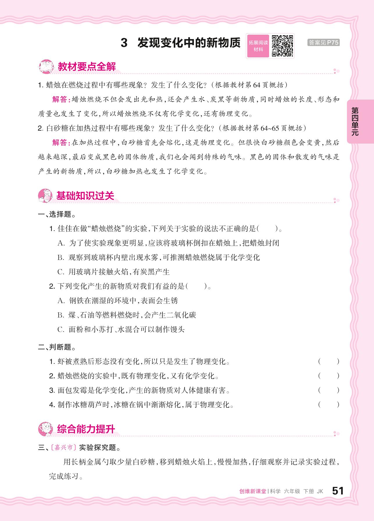 2024春下册六年级科学教科版 第四单元 物质的变化——3. 发现变化中的新物质