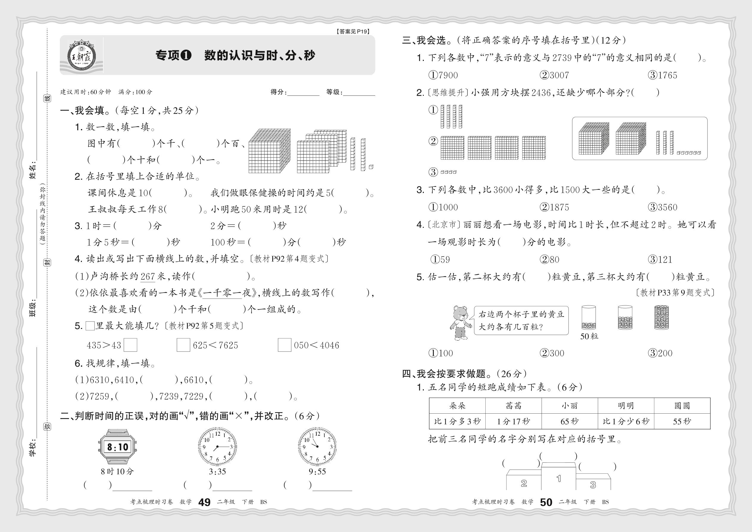 2024春下册二年级数学北师版 期末专项卷KD版·数的认识与时、分、秒【1】