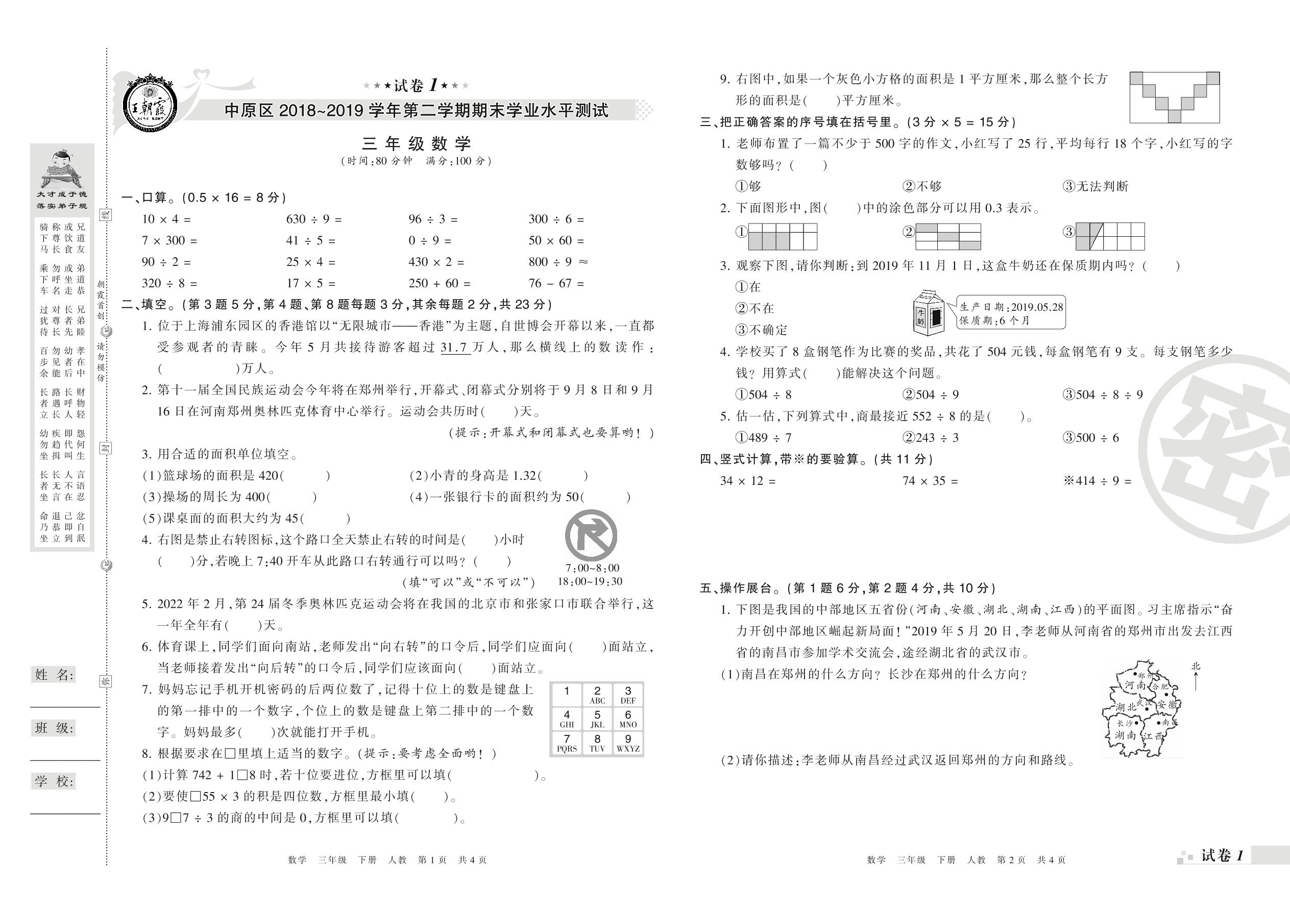 2018-2019学年第二学期郑州市中原区三年级数学试卷(人教版)【1】