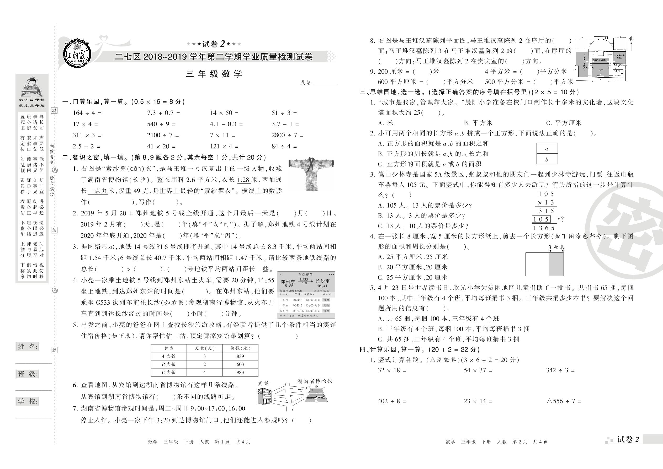 2018-2019学年第二学期郑州市二七区三年级数学试卷(人教版)【2】