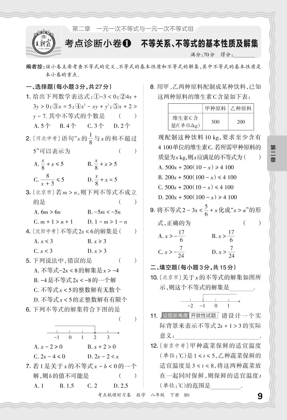 2024春下册八年级数学北师版 第二章 考点诊断小卷 不等关系、不等式的基本性质及解集【1】