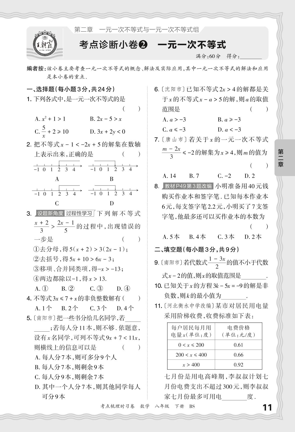 2024春下册八年级数学北师版 第二章 考点诊断小卷 一元一次不等式【2】
