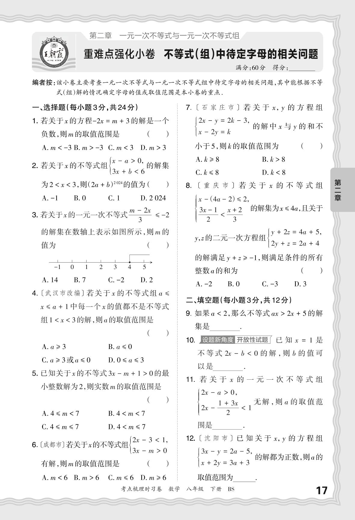 2024春下册八年级数学北师版 第二章 重难点强化小卷 不等式(组)中待定字母的相关问题