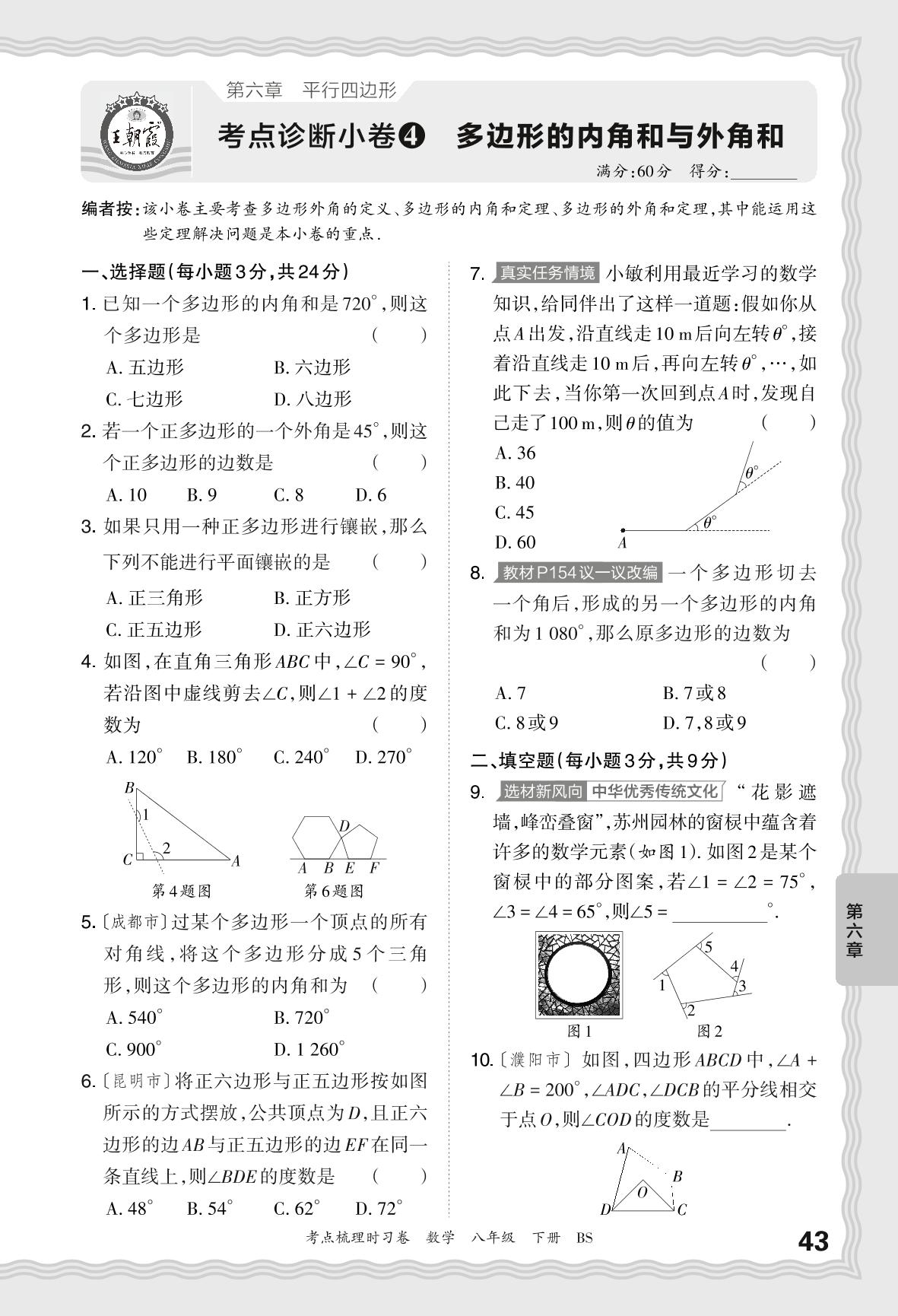 2024春下册八年级数学北师版 第六章 考点诊断小卷 多边形的内角和与外角和【4】