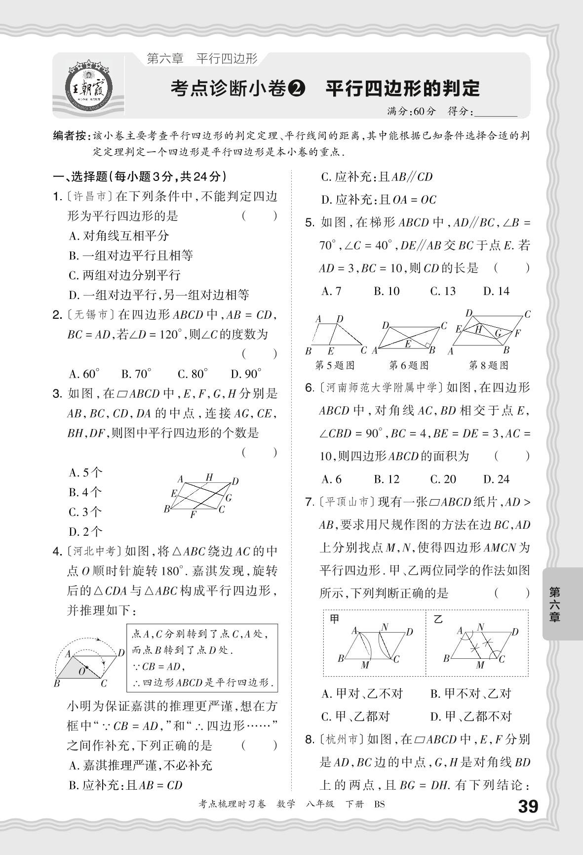 2024春下册八年级数学北师版 第六章 考点诊断小卷 平行四边形的判定【2】