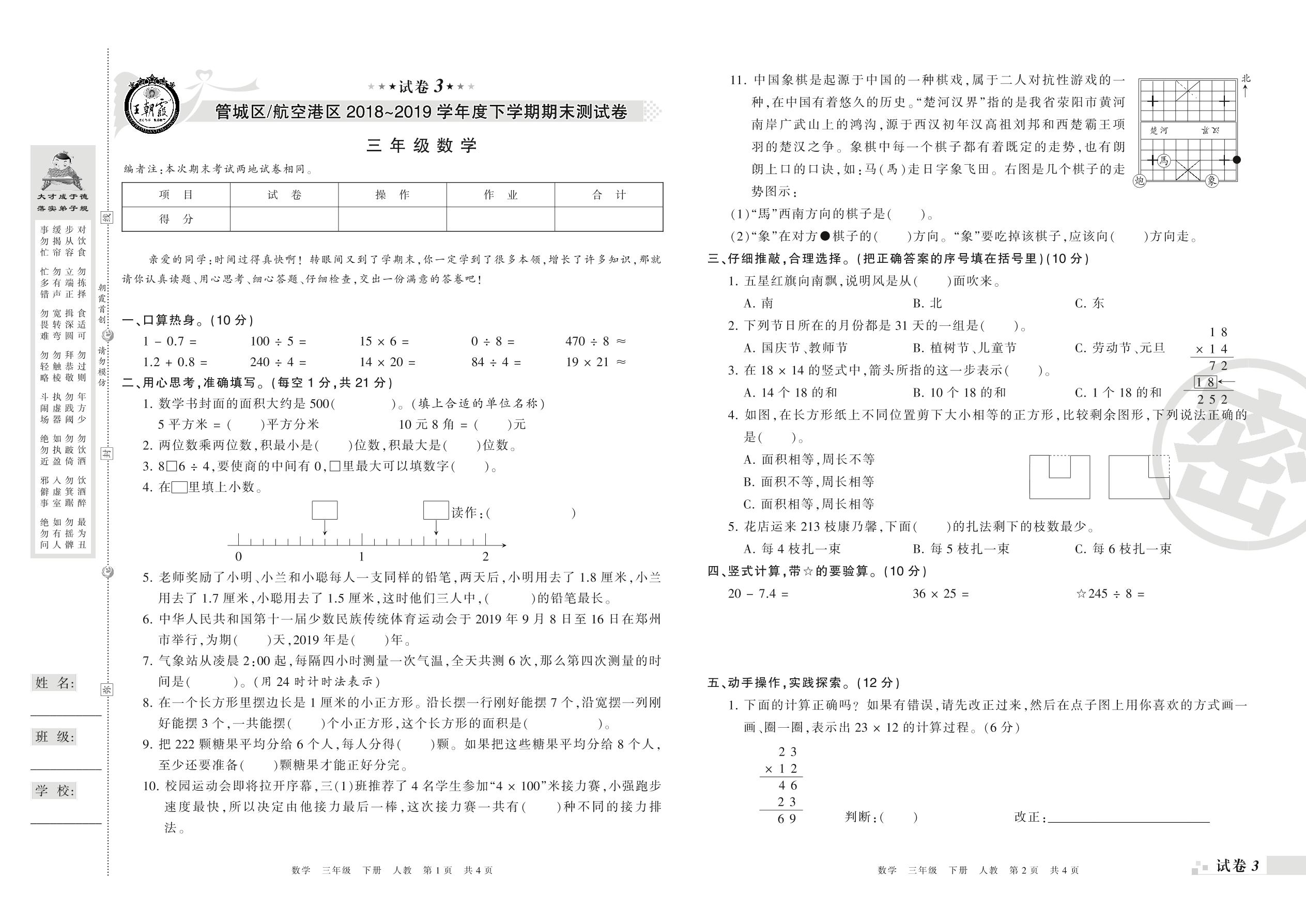 2018-2019学年第二学期郑州市管城区、航空港区三年级数学试卷(人教版)【3】