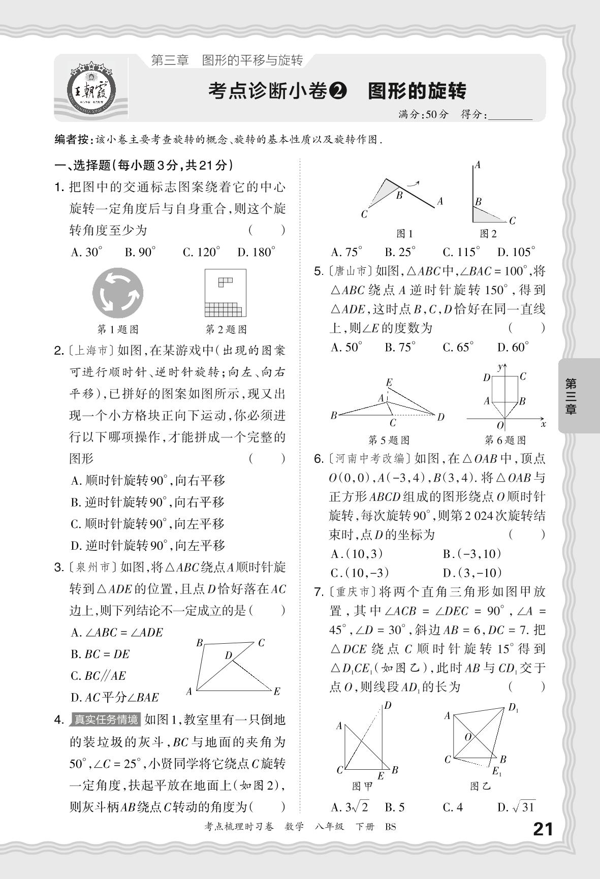 2024春下册八年级数学北师版 第三章 考点诊断小卷 图形的旋转【2】
