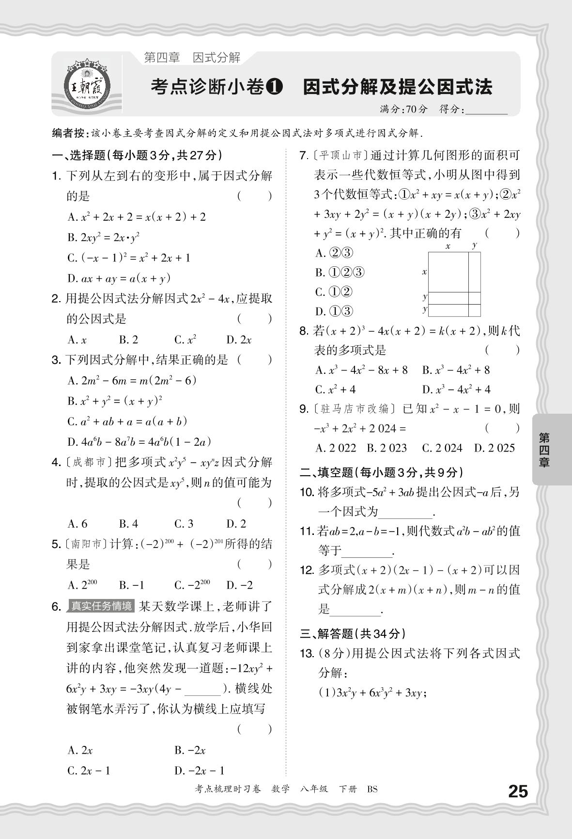 2024春下册八年级数学北师版 第四章 考点诊断小卷 因式分解及提公因式法【1】