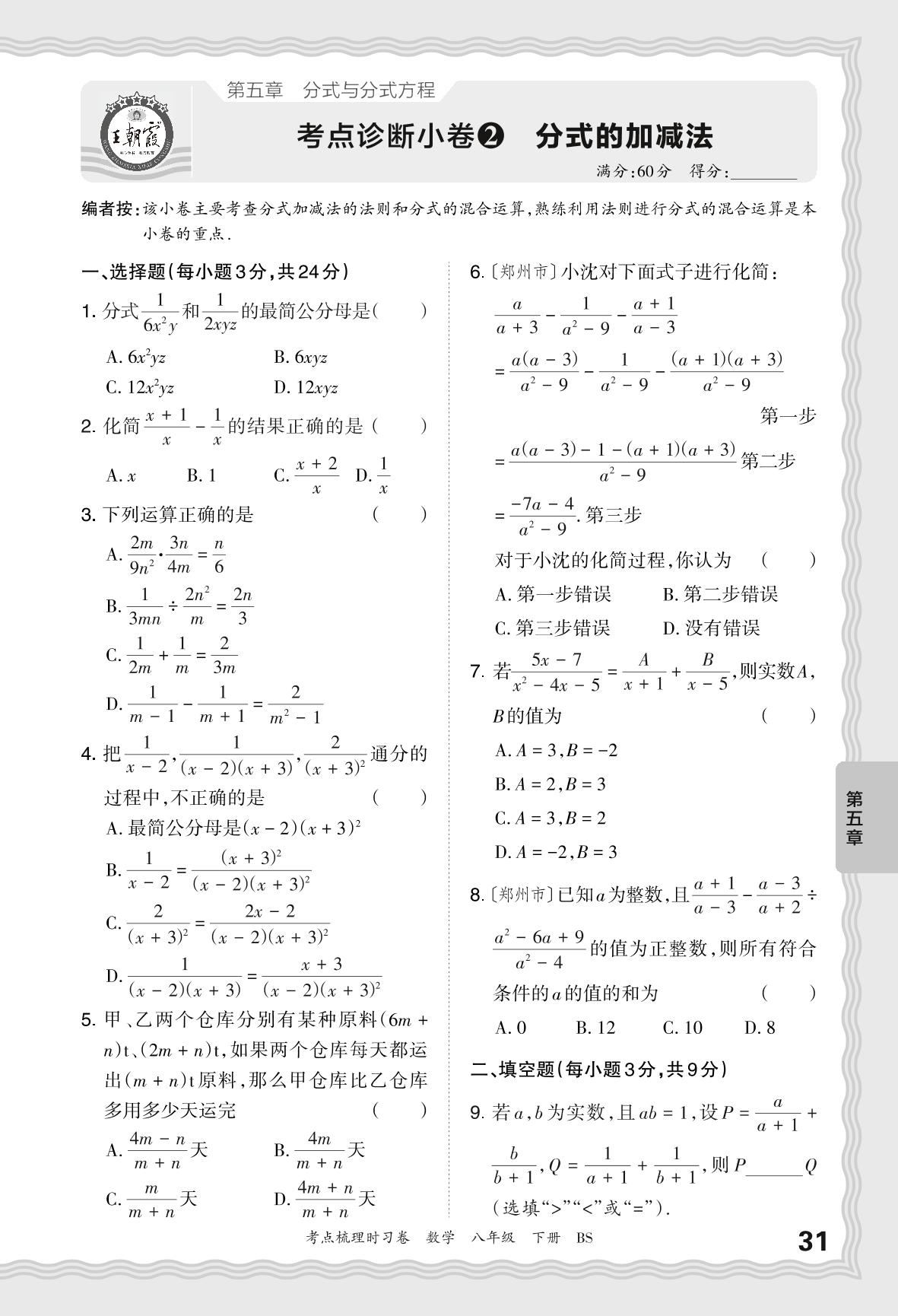 2024春下册八年级数学北师版 第五章 考点诊断小卷 分式的加减法【2】