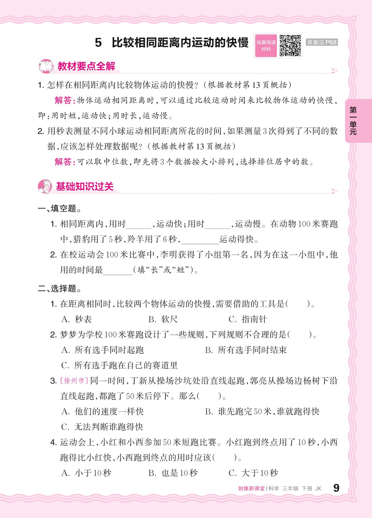 2024春下册三年级科学教科版 第一单元 物体的运动——5. 比较相同距离内运动的快慢