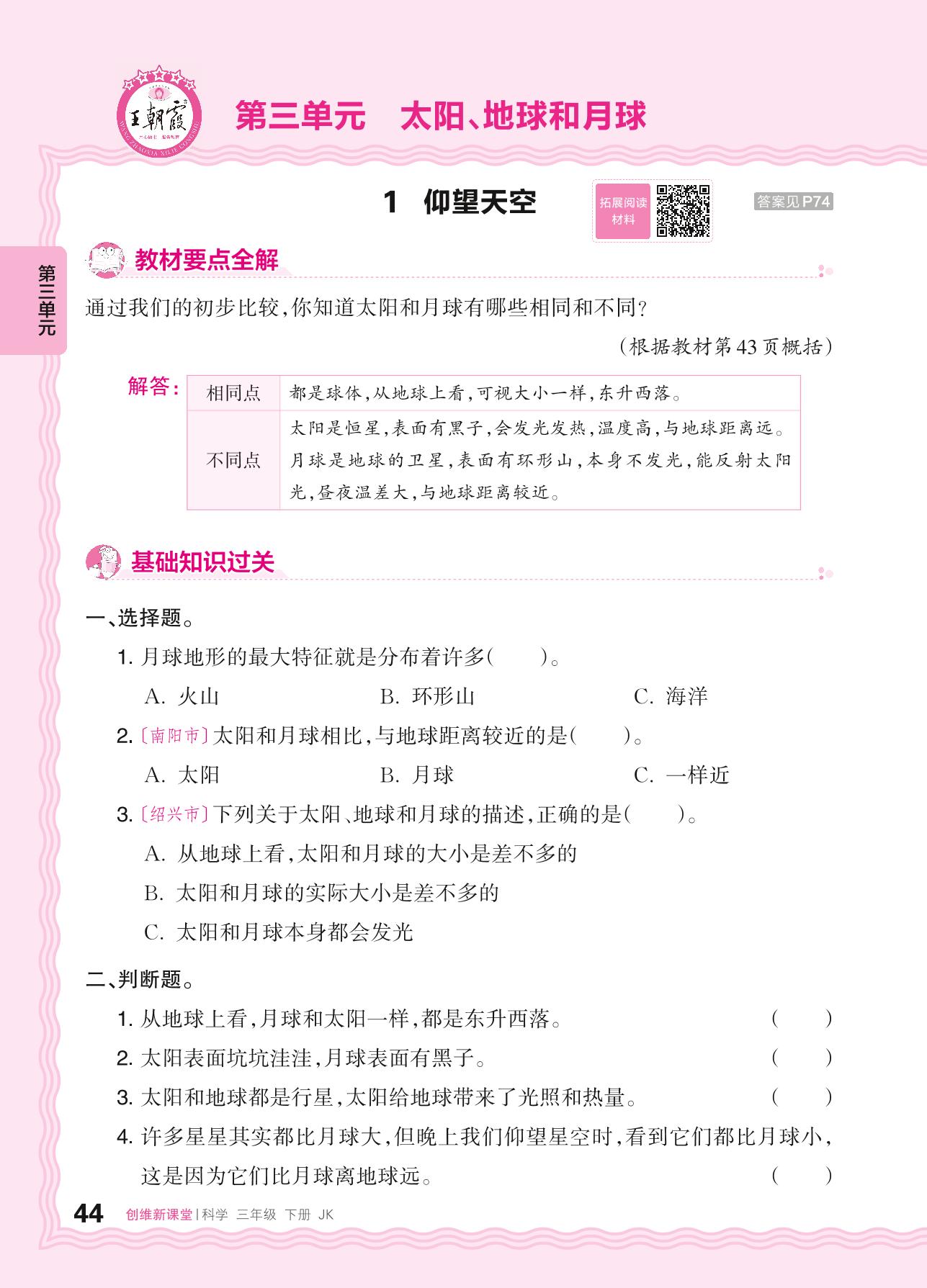 2024春下册三年级科学教科版 第三单元 太阳、地球和月球——1. 仰望天空
