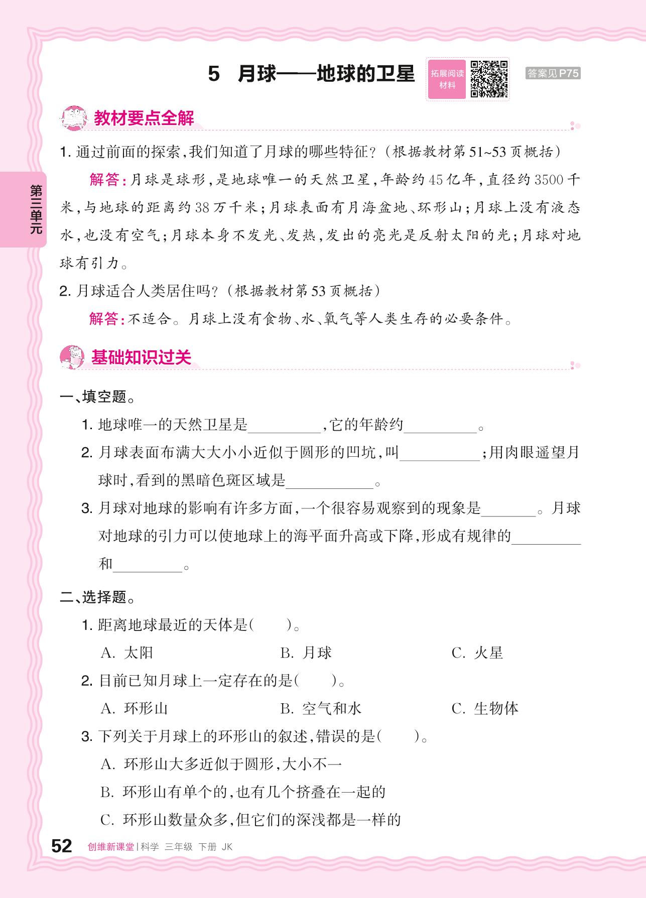 2024春下册三年级科学教科版 第三单元 太阳、地球和月球——5. 月球 地球的卫星