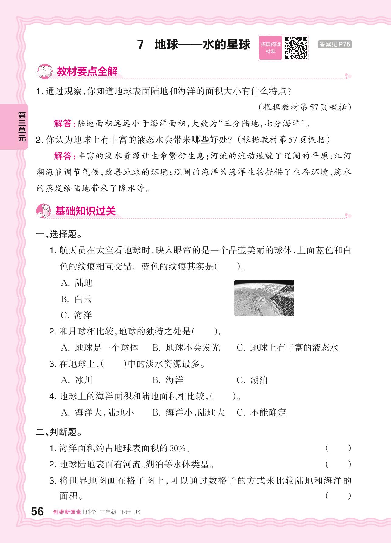 2024春下册三年级科学教科版 第三单元 太阳、地球和月球——7. 地球 水的星球