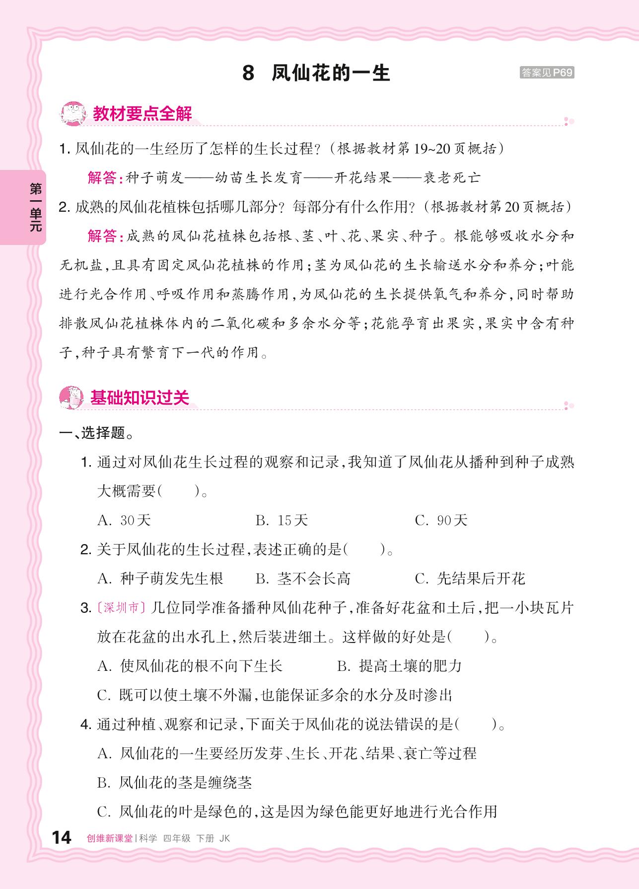 2024春下册四年级科学教科版 第一单元 植物的生长变化——8. 凤仙花的一生