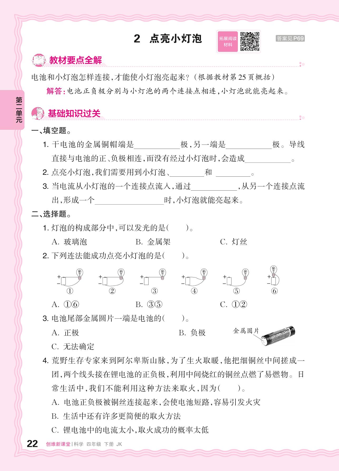 2024春下册四年级科学教科版 第二单元 电路——2. 点亮小灯泡