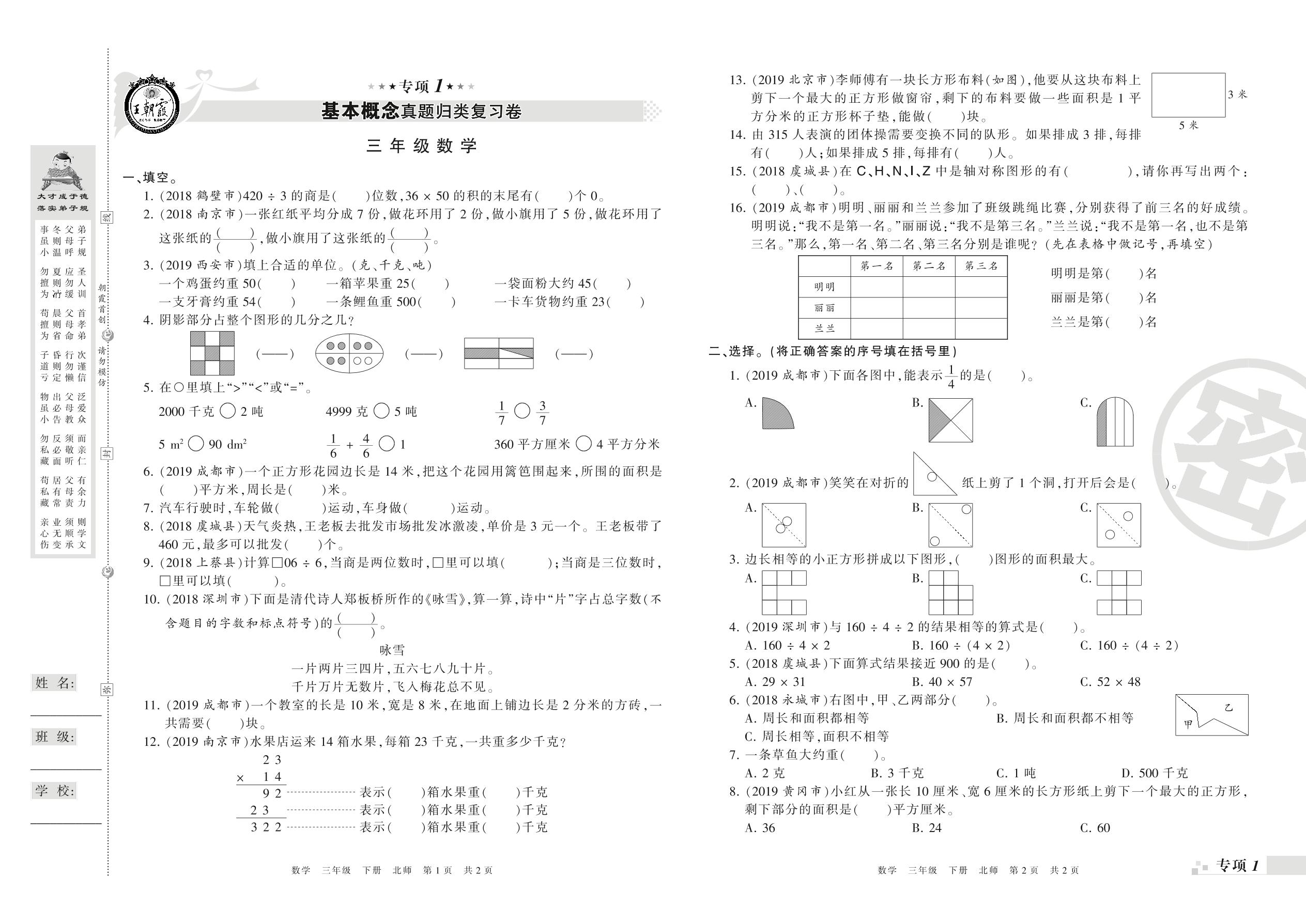 王朝霞期末专项卷——基本概念、计算真题归类复习卷三年级下册数学(北师版)_R21080493515【0】