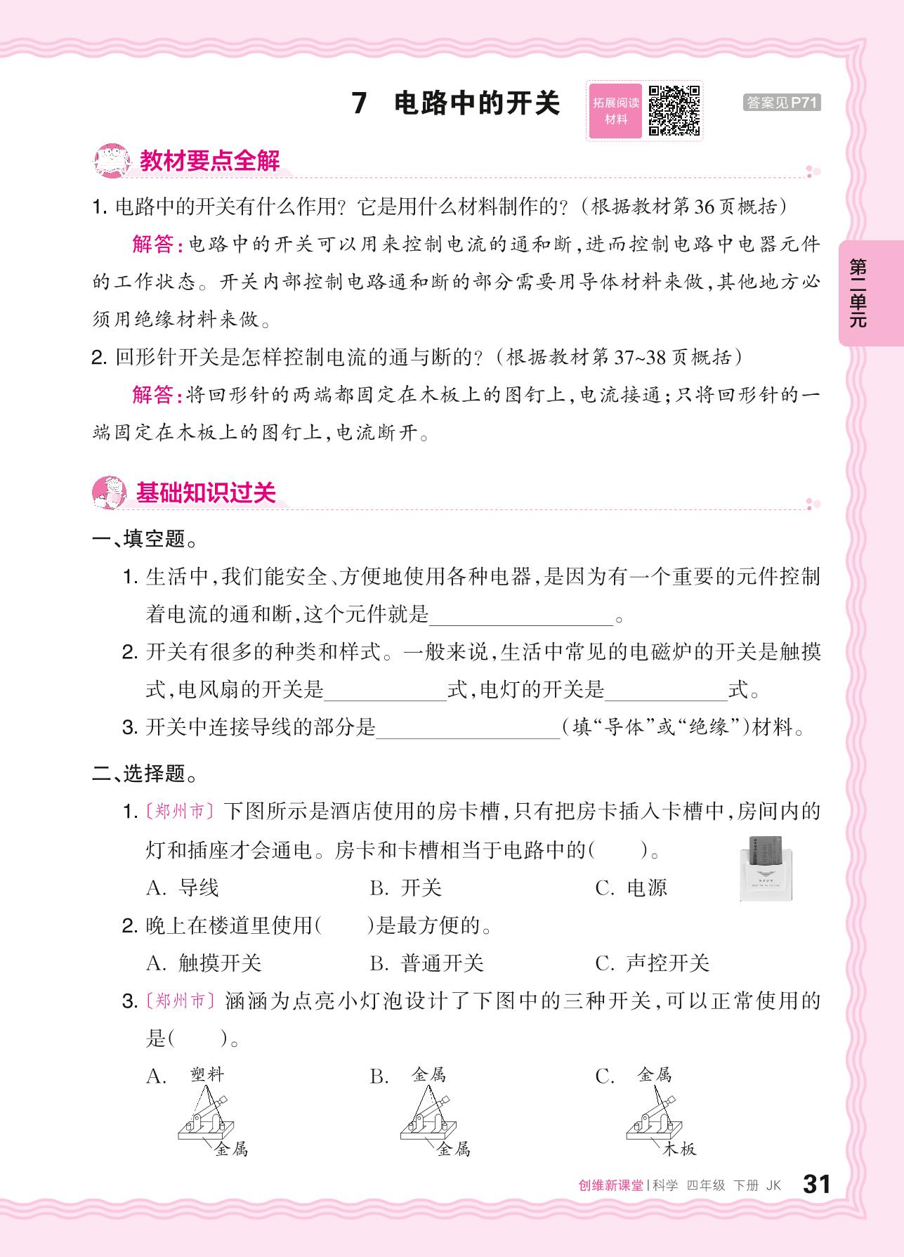 2024春下册四年级科学教科版 第二单元 电路——7. 电路中的开关