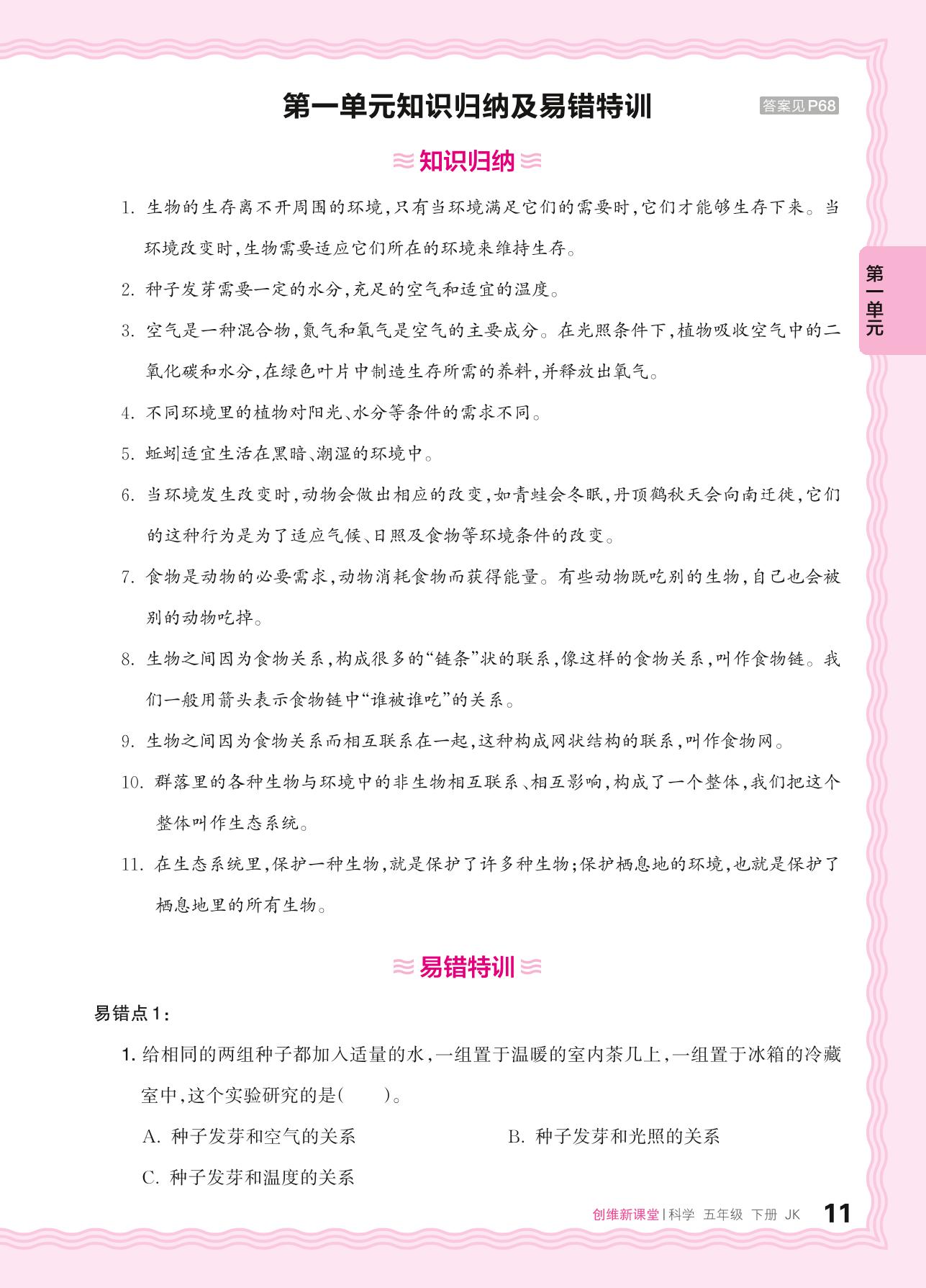 2024春下册五年级科学教科版 第一单元知识归纳及易错特训