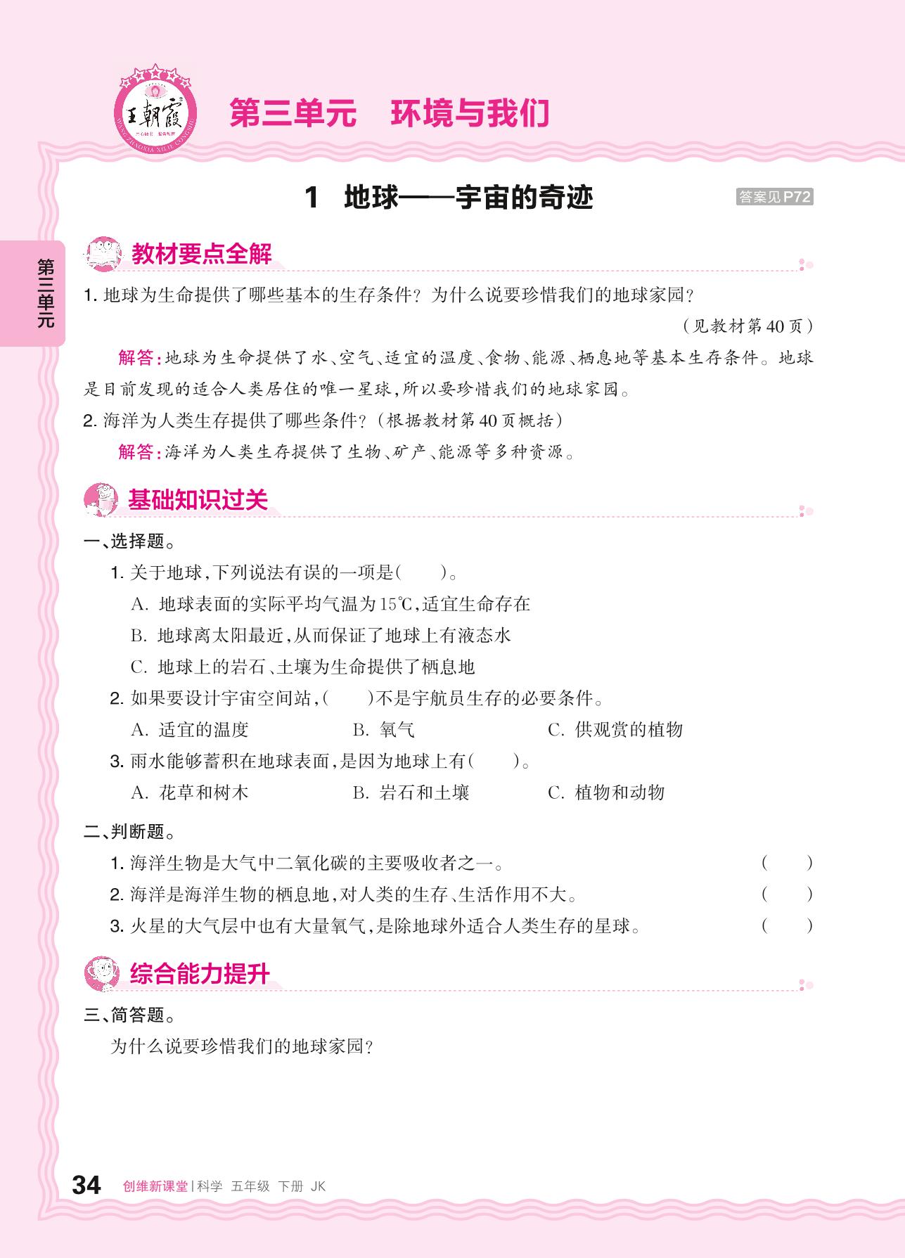 2024春下册五年级科学教科版 第三单元 环境与我们——1. 地球 宇宙的奇迹