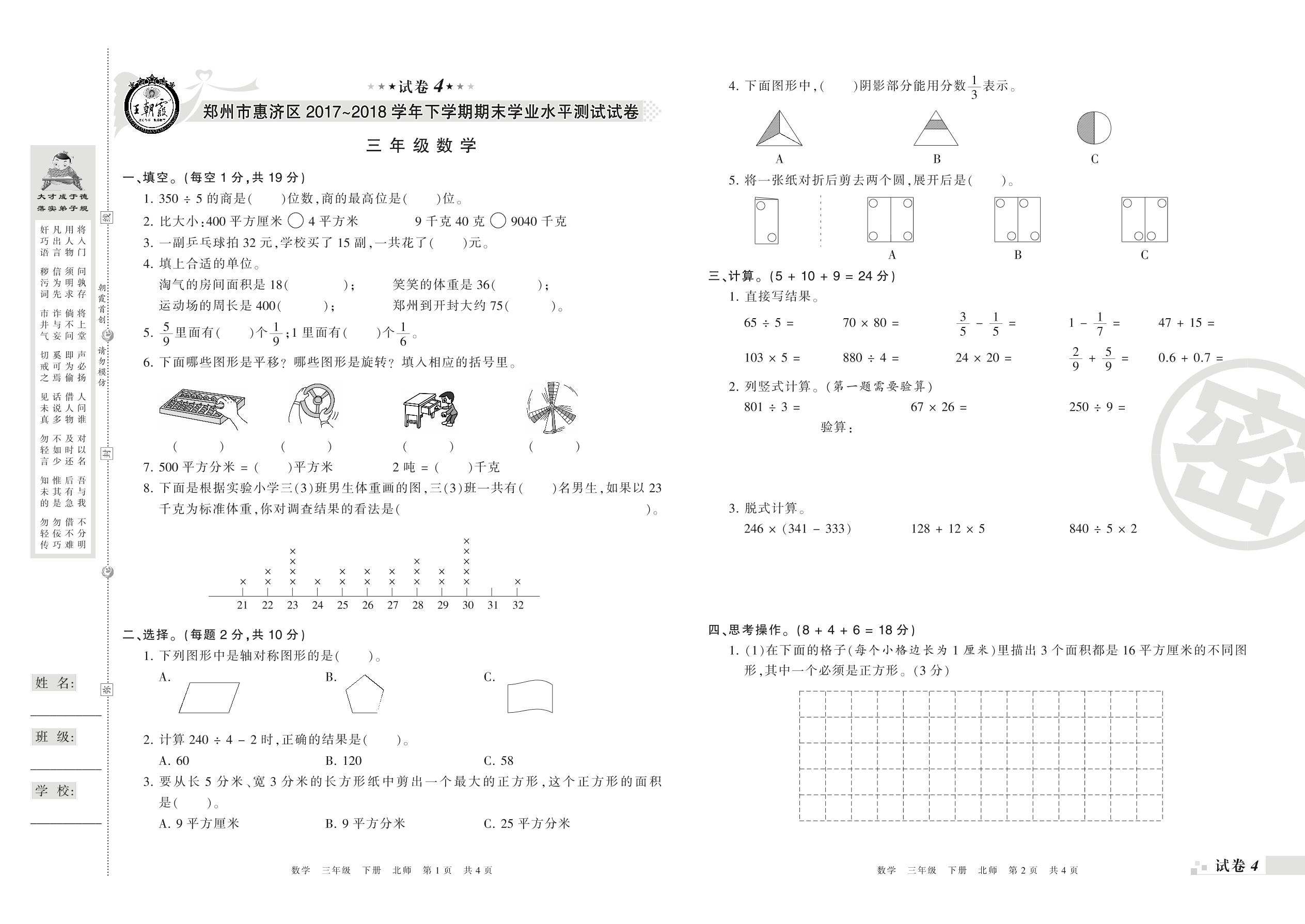 2017-2018学年第二学期郑州市惠济区三年级数学试卷(北师版)【4】