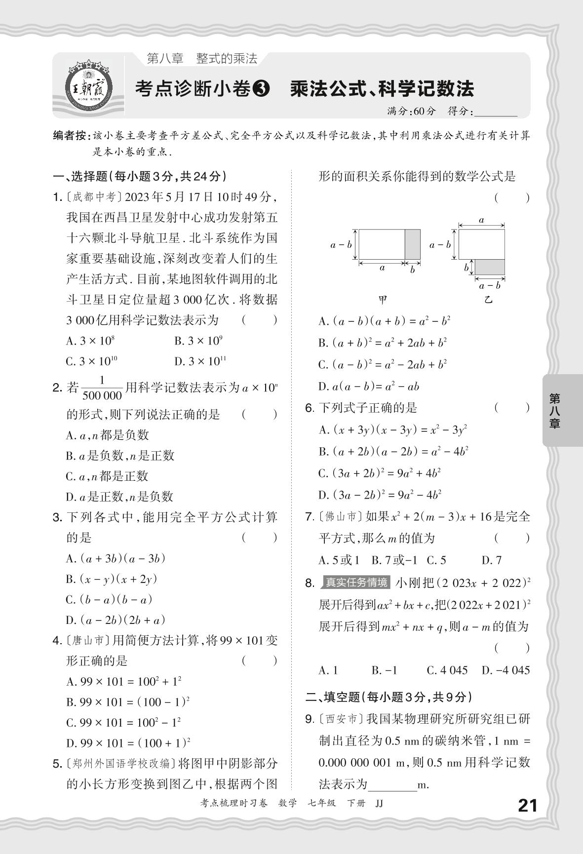 2024春下册七年级数学冀教版 第八章 考点诊断小卷 乘法公式、科学记数法【3】