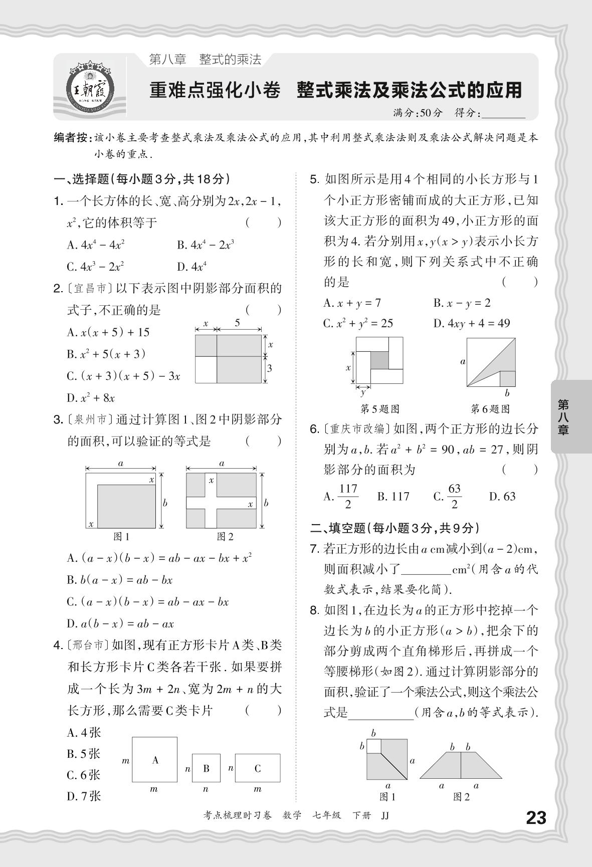 2024春下册七年级数学冀教版 第八章 重难点强化小卷 整式乘法及乘法公式的应用