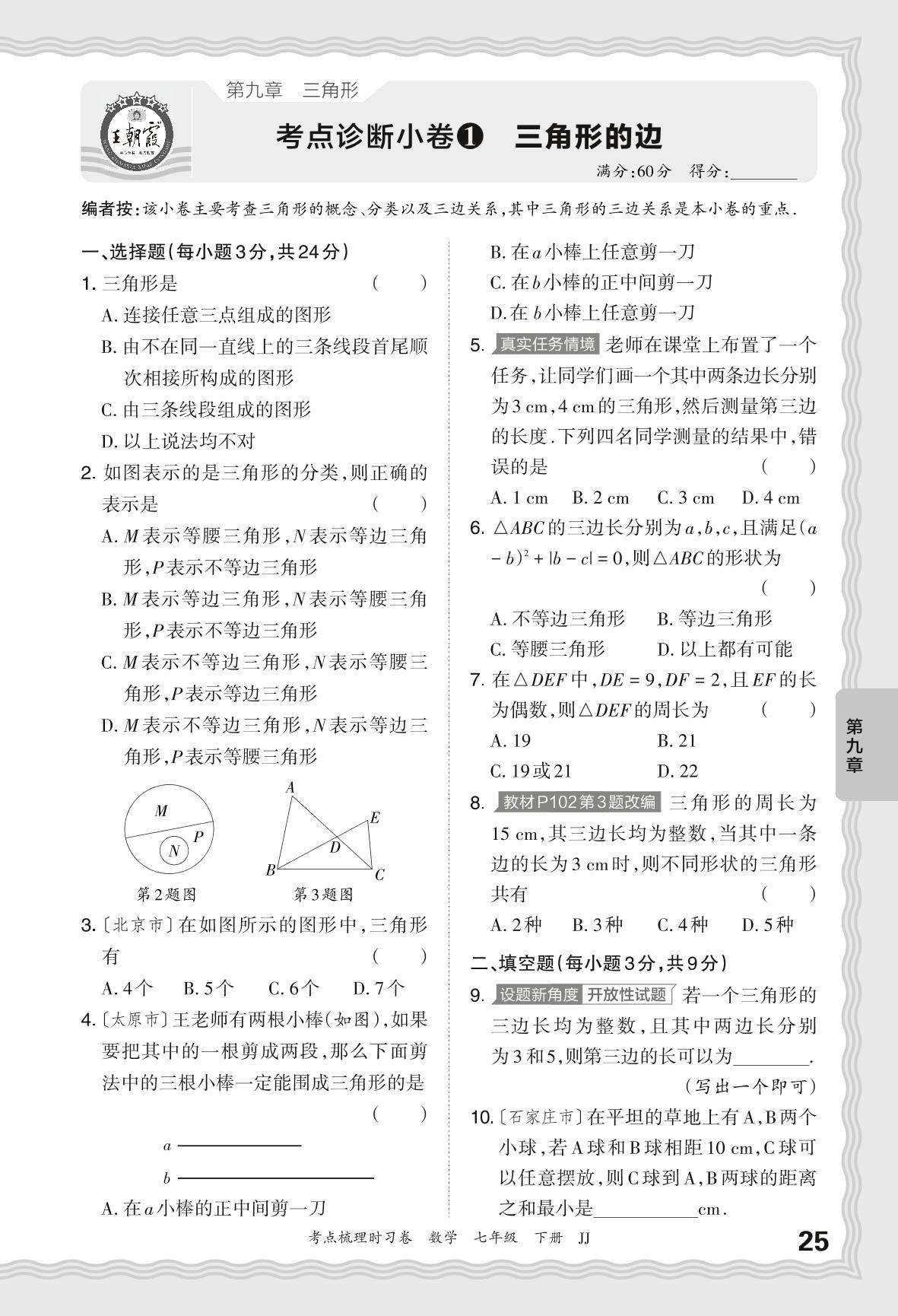 2024春下册七年级数学冀教版 第九章 考点诊断小卷 三角形的边【1】