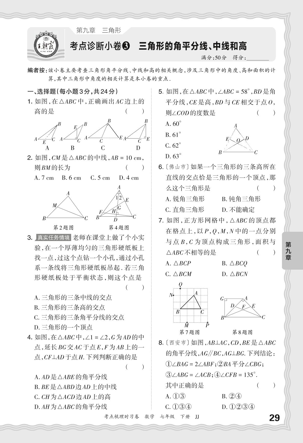 2024春下册七年级数学冀教版 第九章 考点诊断小卷 三角形的角平分线、中线和高【3】