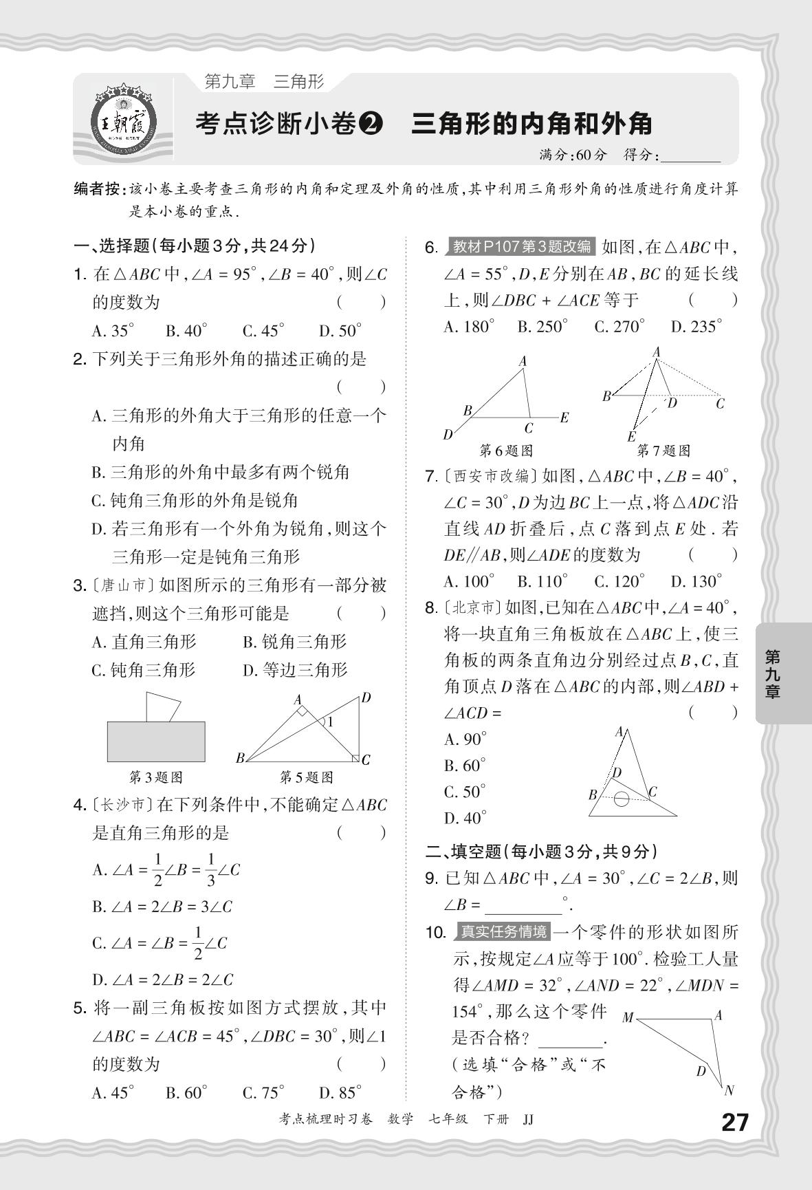 2024春下册七年级数学冀教版 第九章 考点诊断小卷 三角形的内角和外角【2】