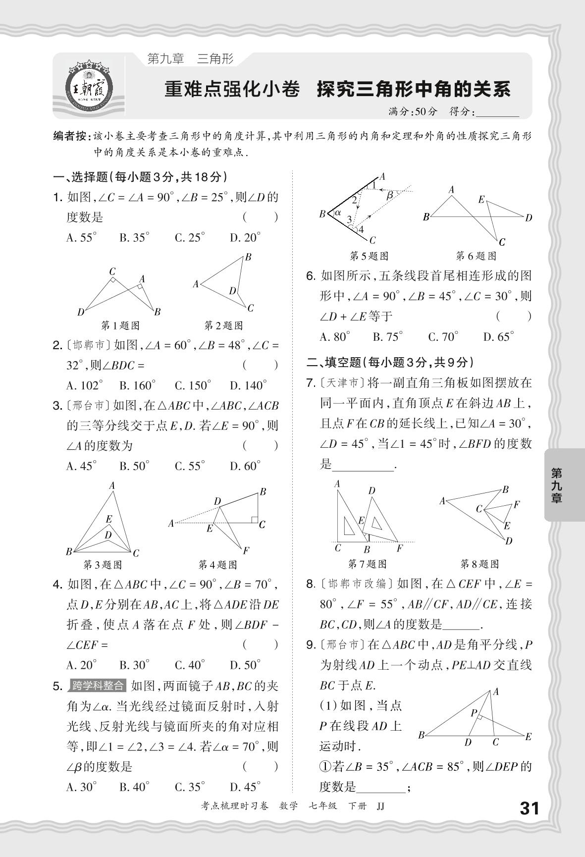 2024春下册七年级数学冀教版 第九章 重难点强化小卷 探究三角形中角的关系