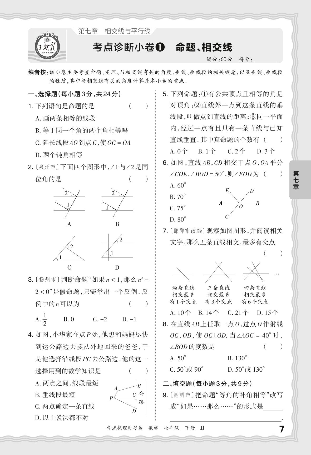 2024春下册七年级数学冀教版 第七章 考点诊断小卷 命题、相交线【1】