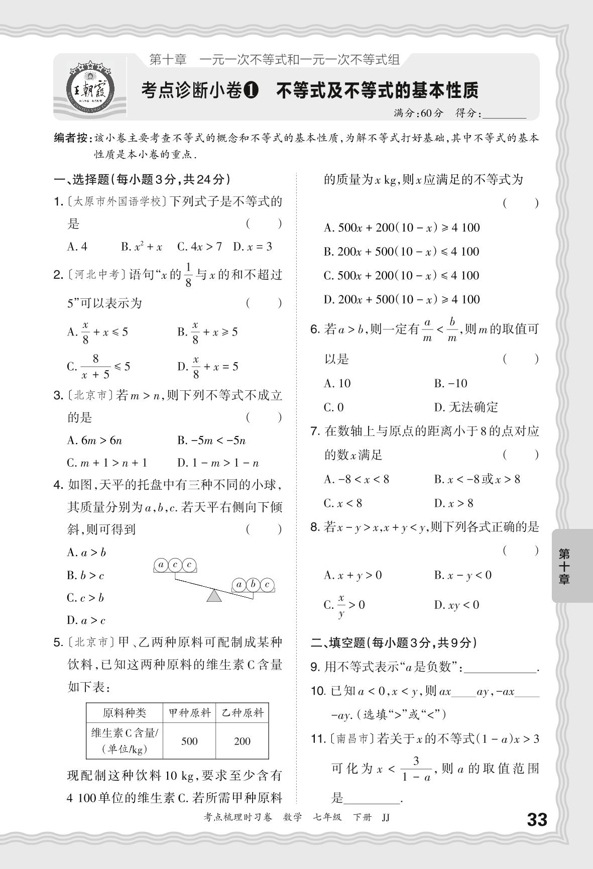 2024春下册七年级数学冀教版 第十章 考点诊断小卷 不等式及不等式的基本性质【1】