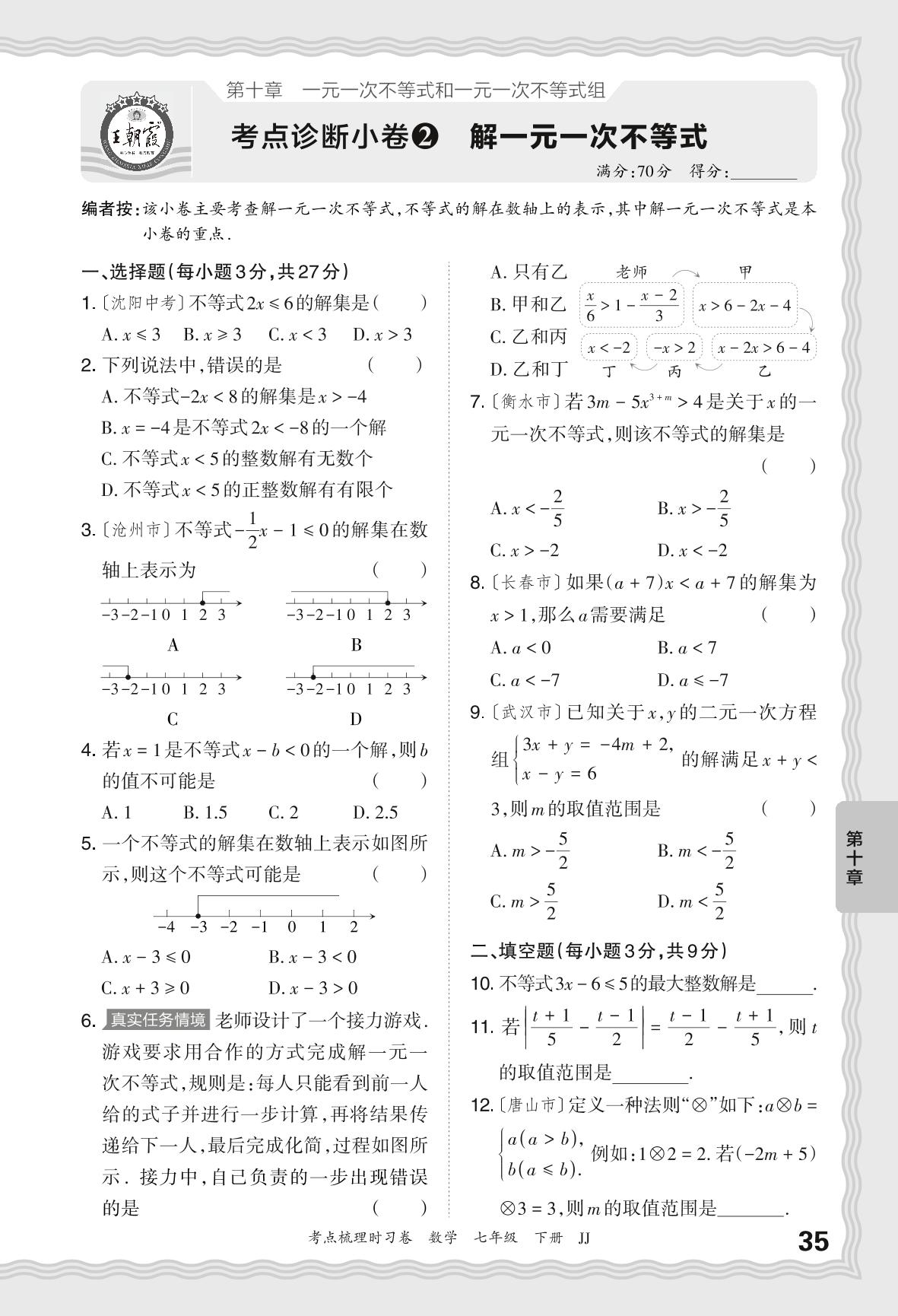 2024春下册七年级数学冀教版 第十章 考点诊断小卷 解一元一次不等式【2】