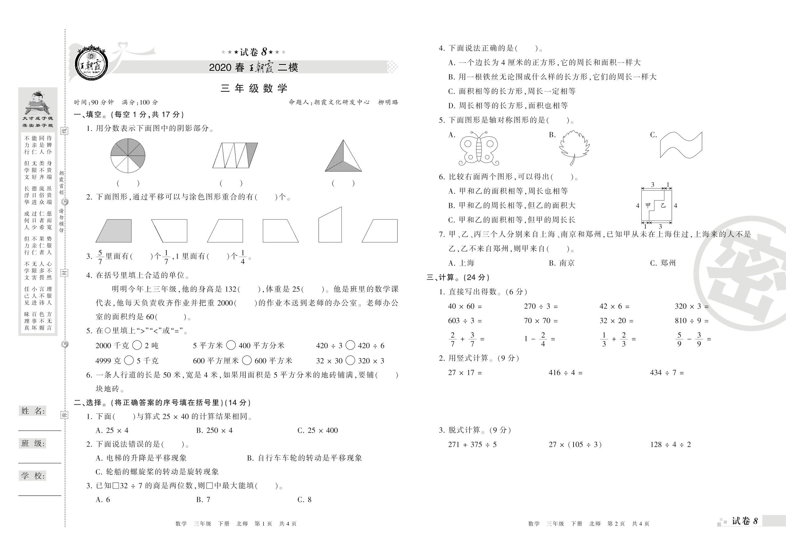 王朝霞期末模拟卷三年级下册数学(北师版)_R21080493551【8】
