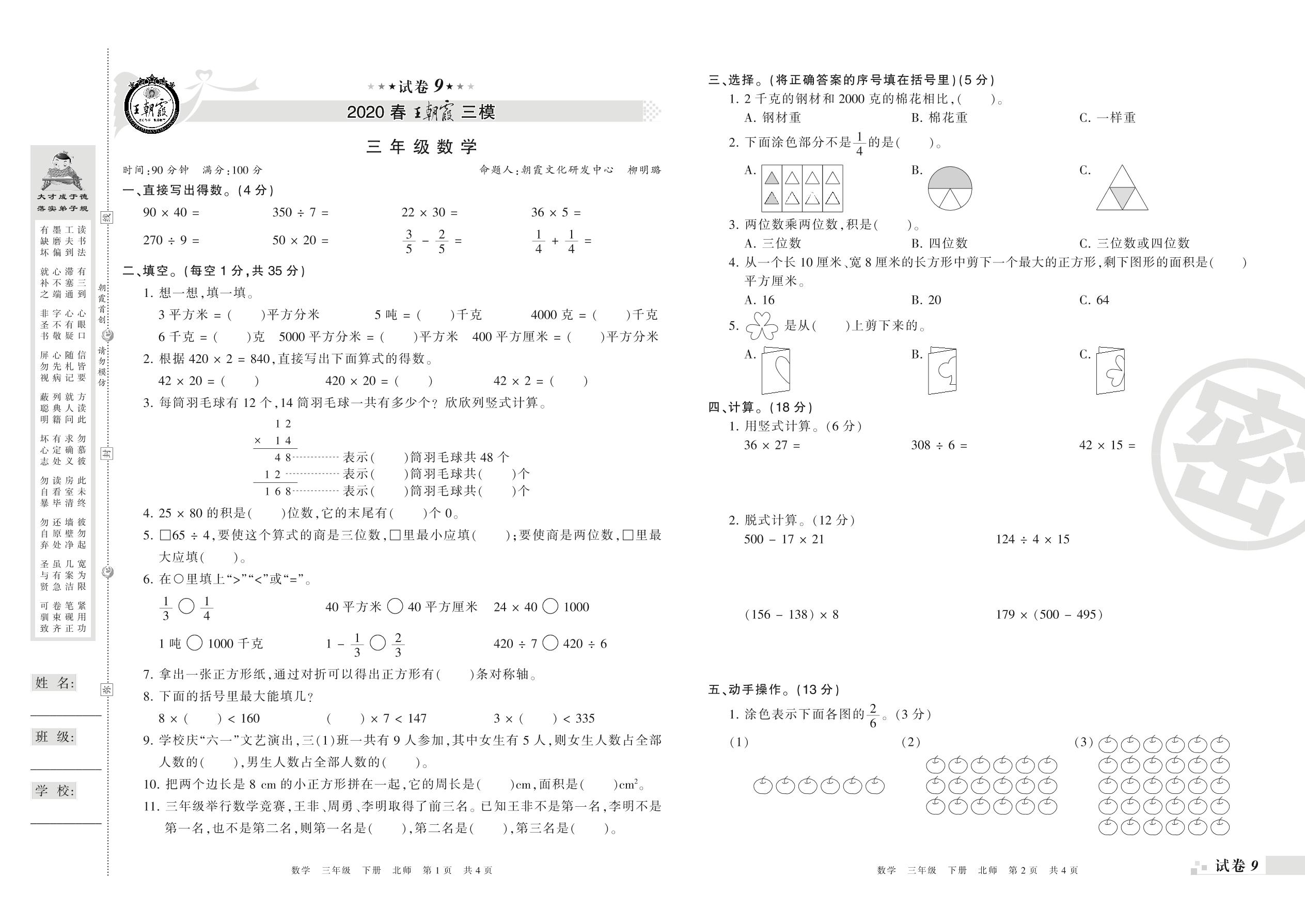 王朝霞期末模拟卷三年级下册数学(北师版)_R21080493555【9】