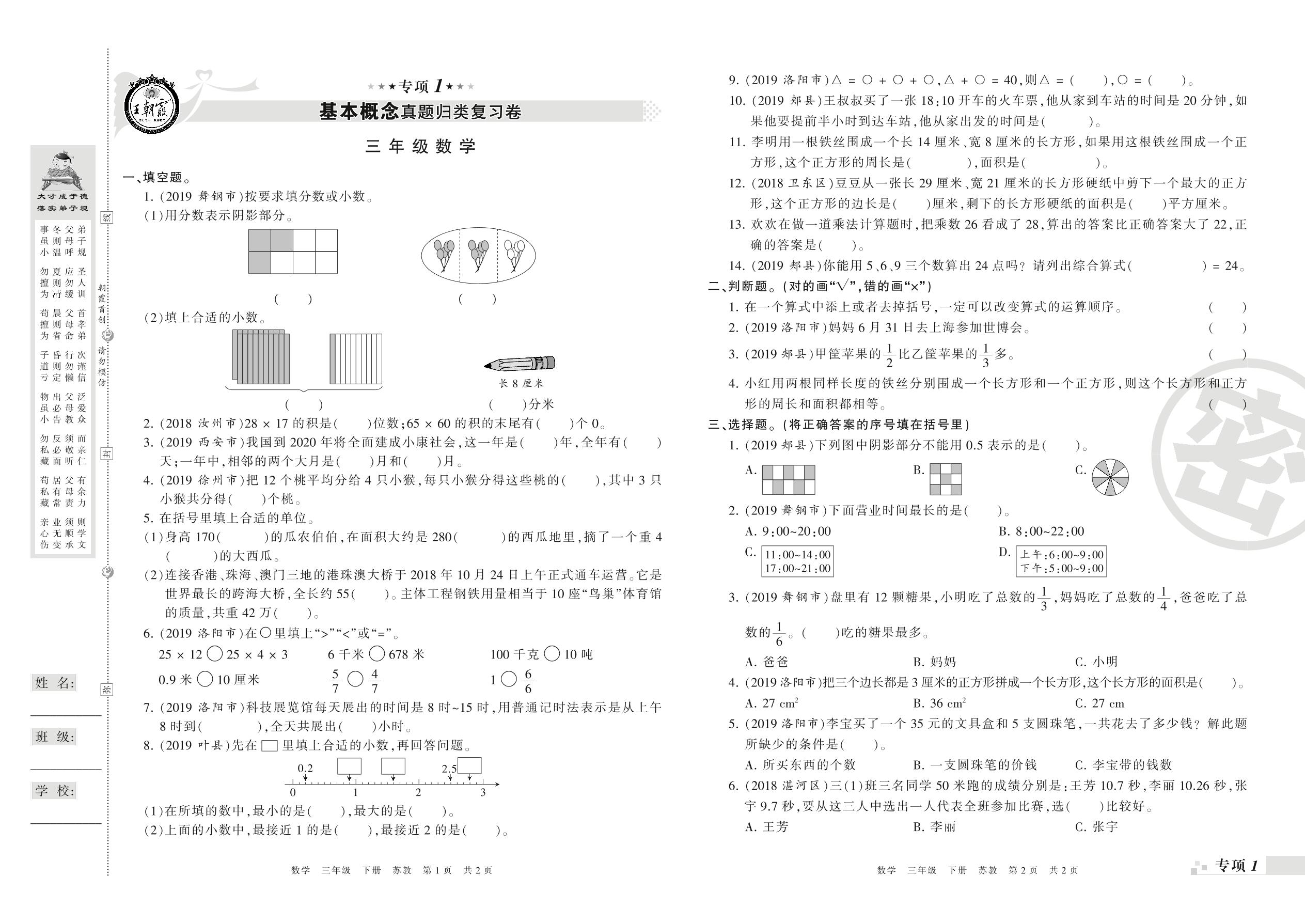 王朝霞期末专项卷——基本概念、计算真题归类复习卷三年级下册数学(苏教版)_R21080493609【0】