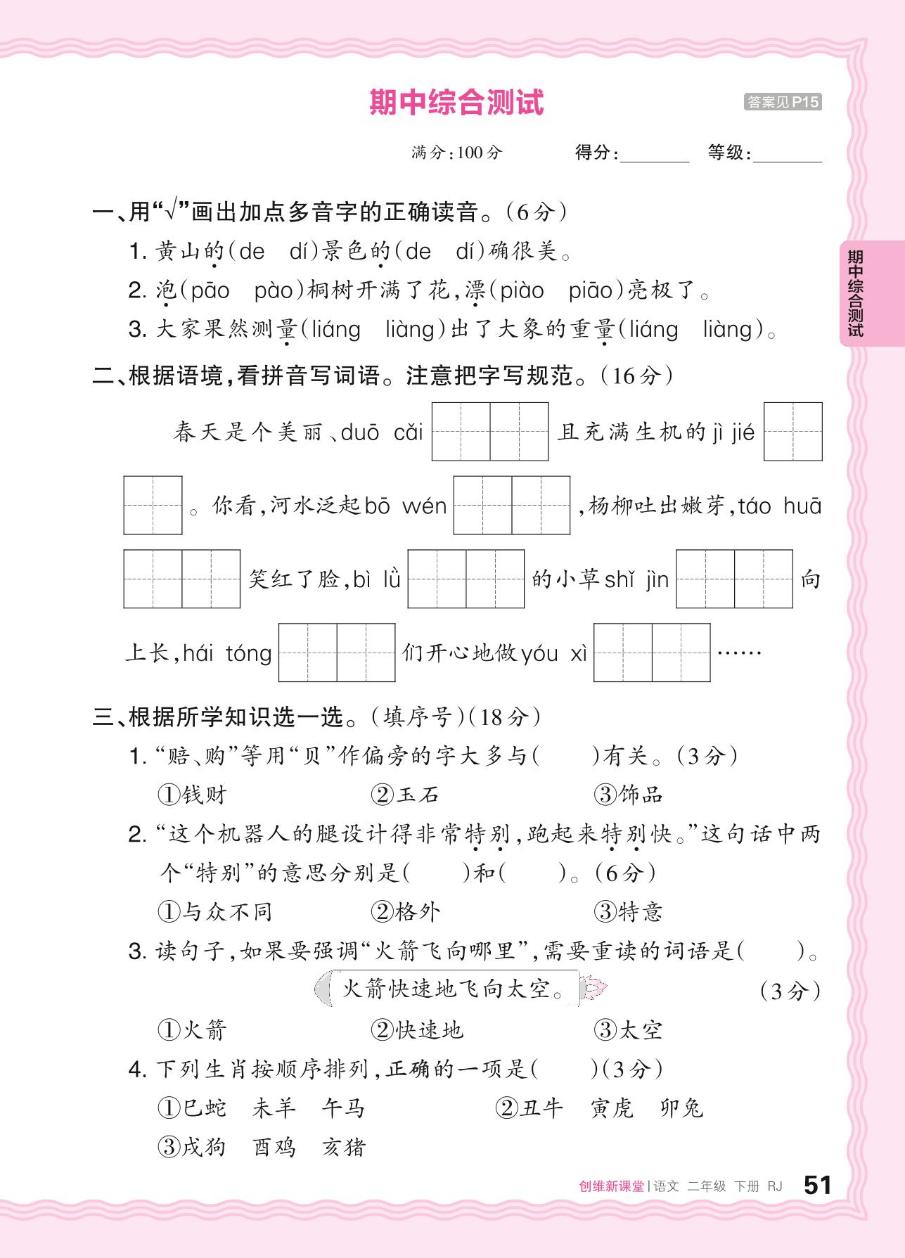 2024春下册二年级语文人教版 期中综合测试