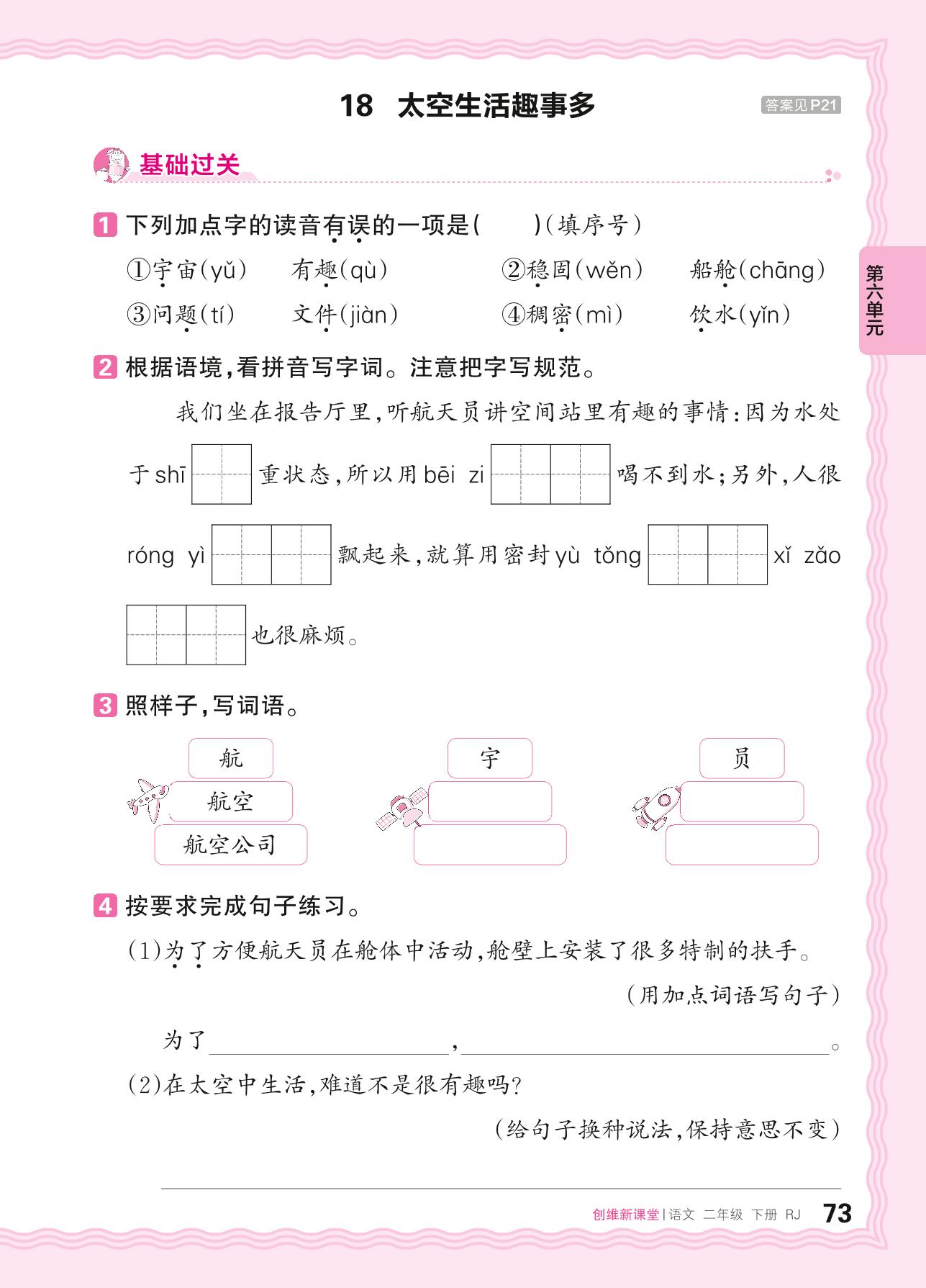 2024春下册二年级语文人教版 第六单元 大自然的秘密——18. 太空生活趣事多
