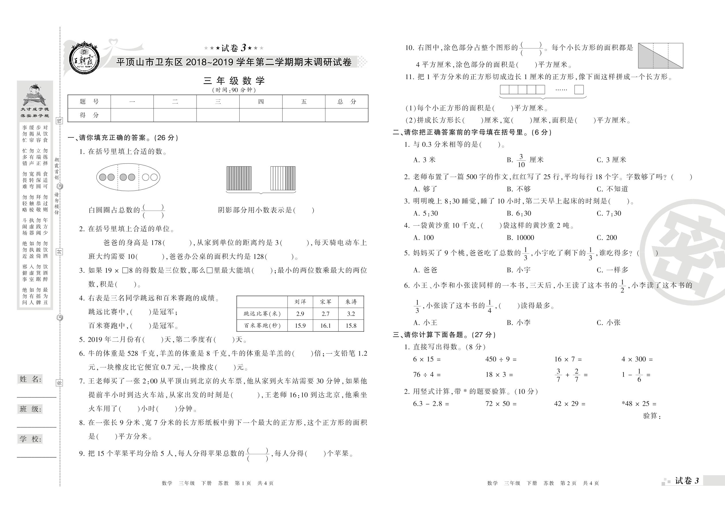 2018-2019学年第二学期平顶山市卫东区三年级数学试卷(苏教版)【3】