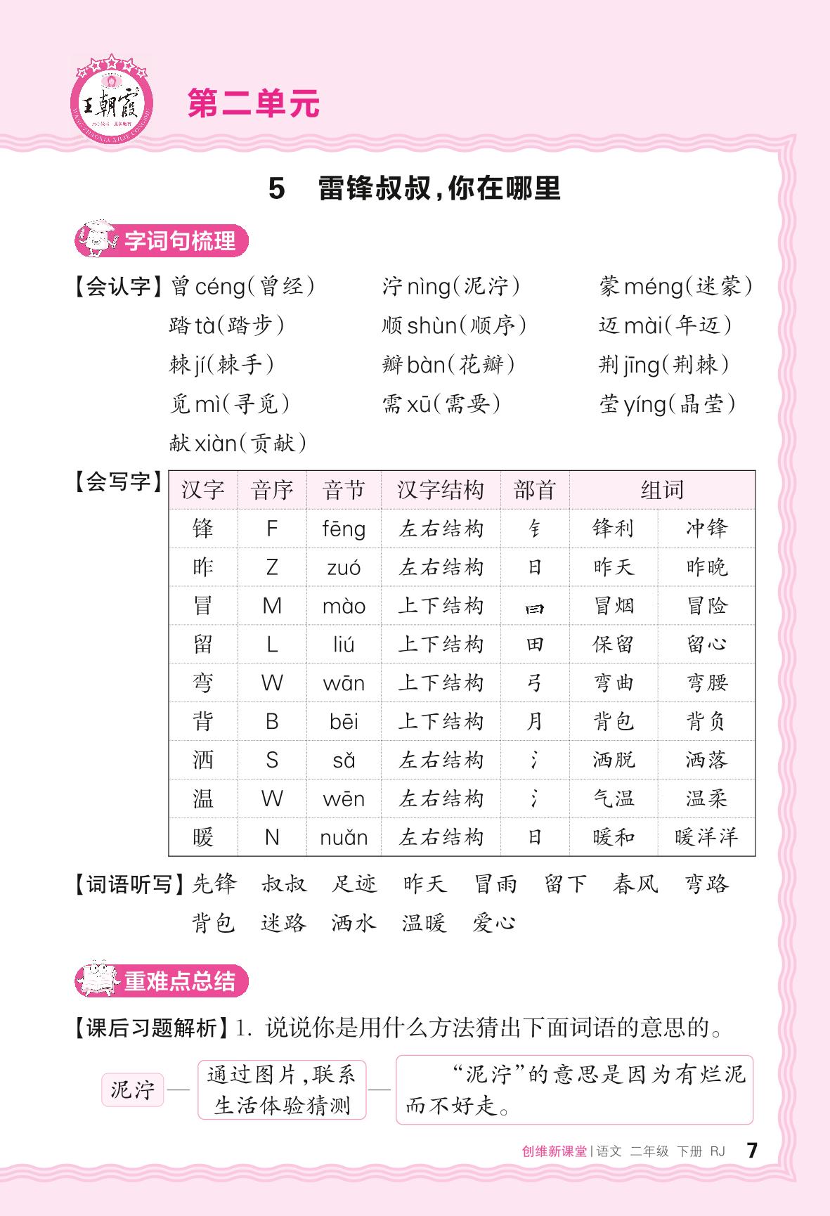 2024春下册二年级语文人教版 助学手册 第二单元——5. 雷锋叔叔,你在哪里