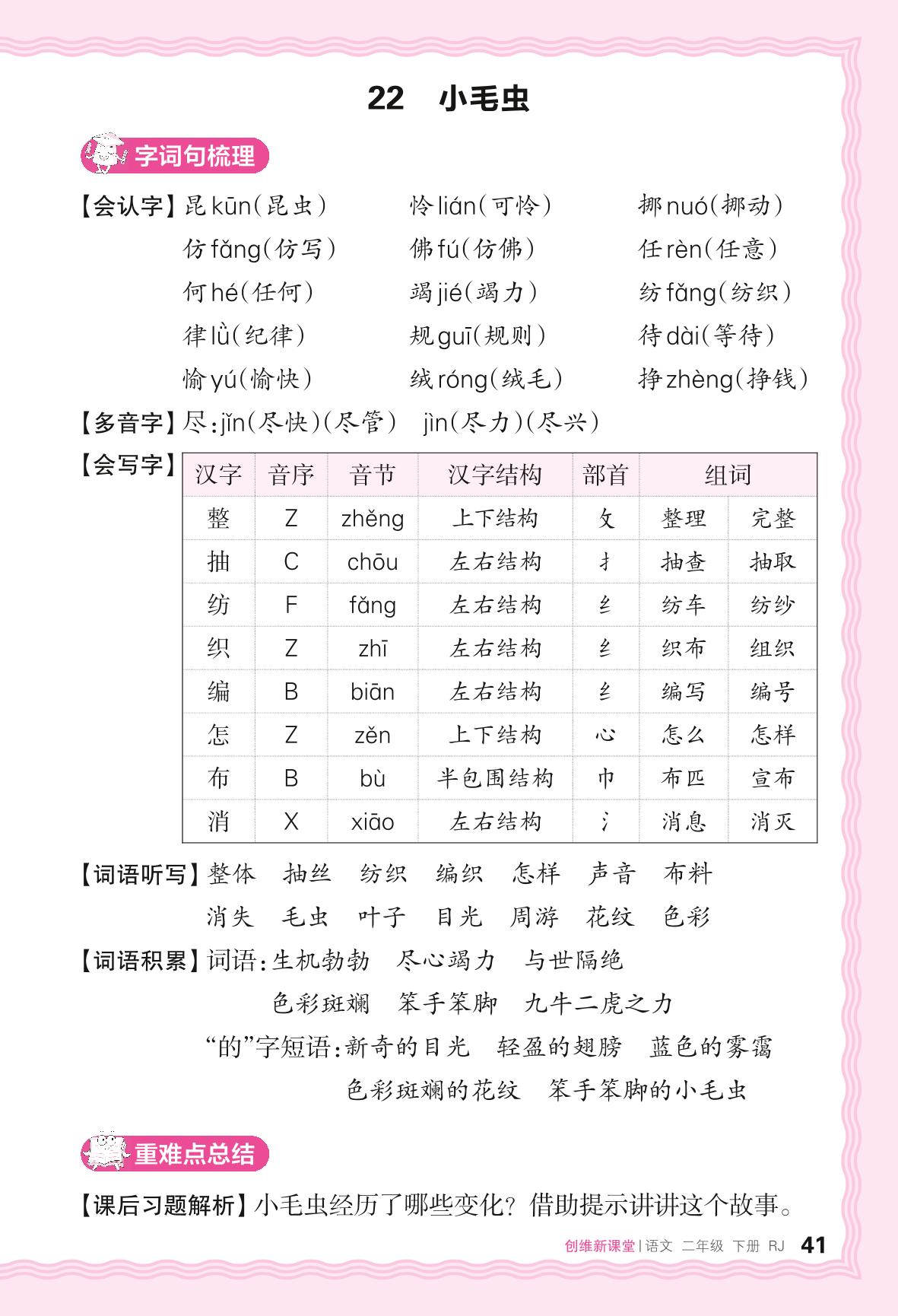 2024春下册二年级语文人教版 助学手册 第七单元——22. 小毛虫