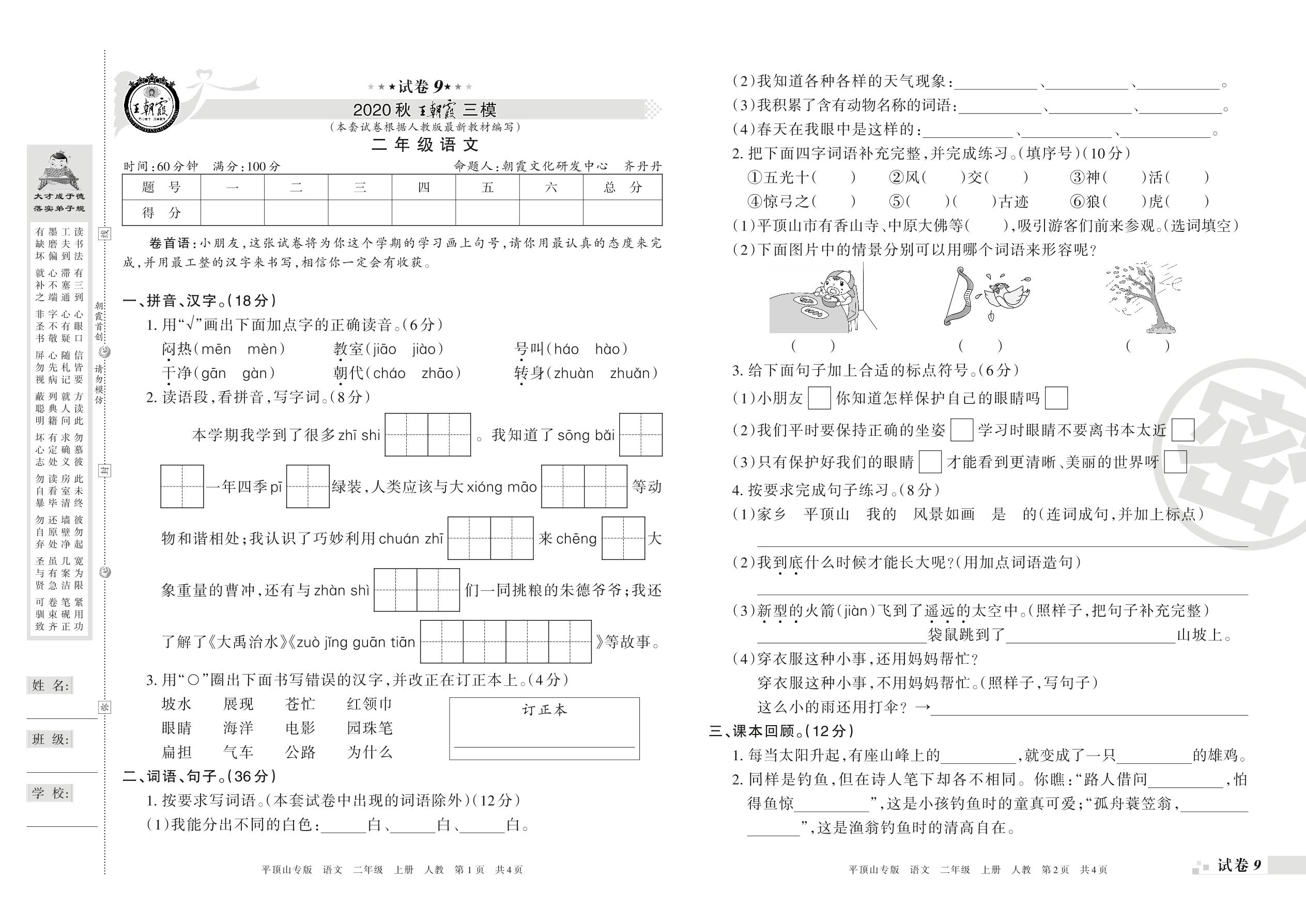 王朝霞期末模拟卷二年级上册语文(人教版)_R21080164303【9】