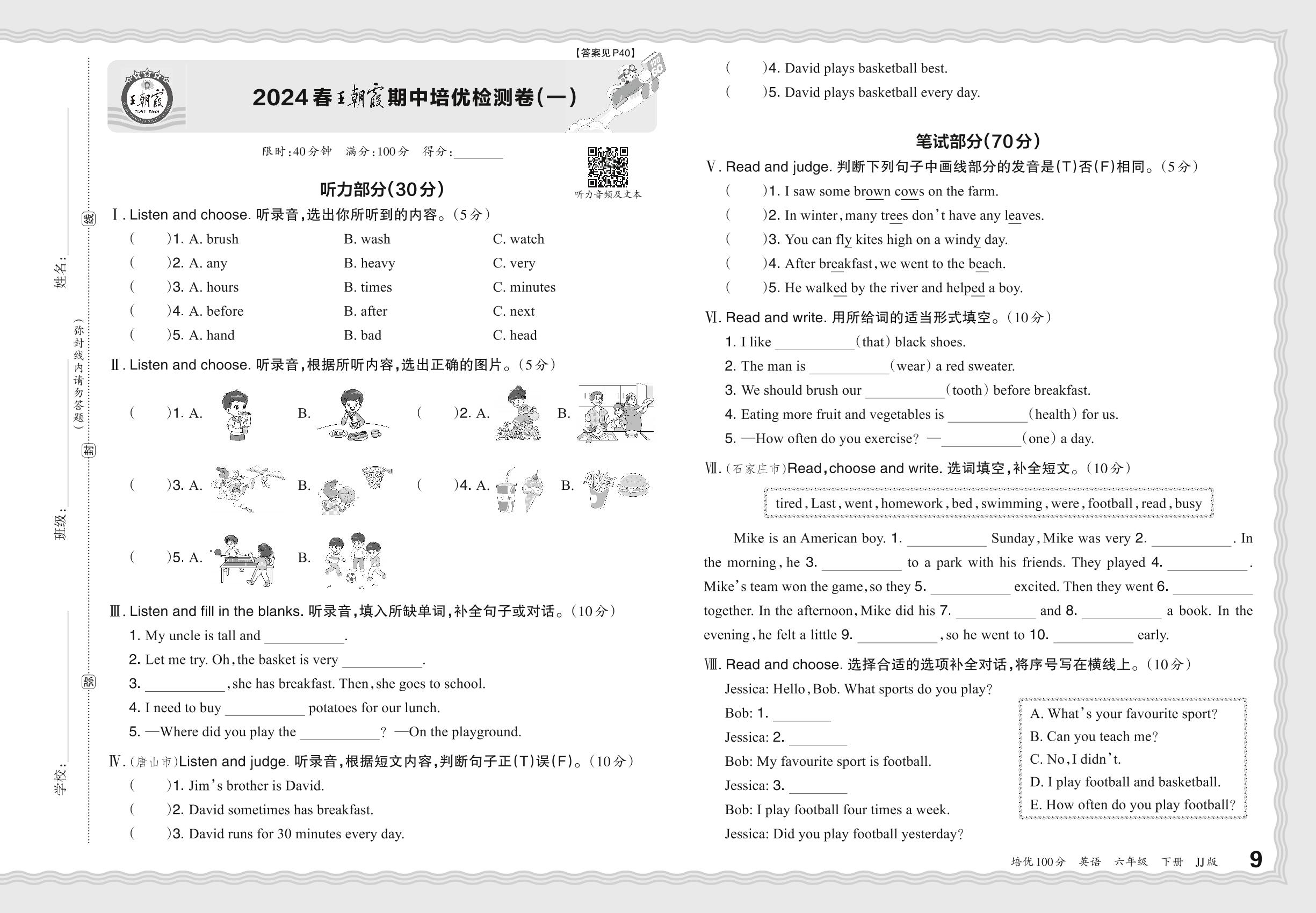 2024春下册六年级英语冀教版 王朝霞期中培优检测卷(一)