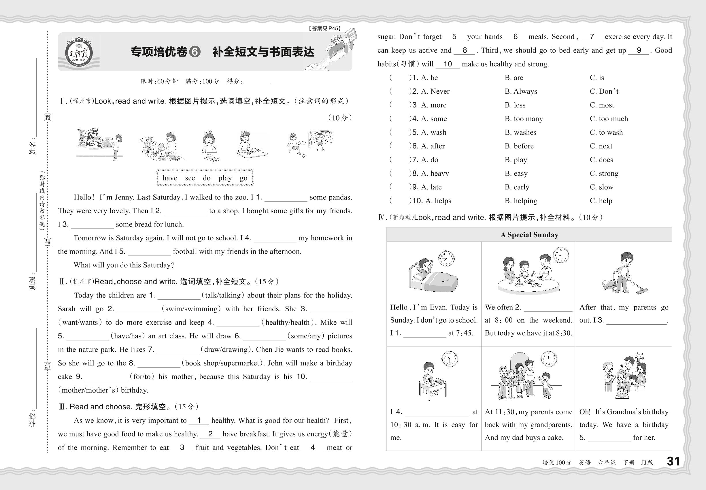 2024春下册六年级英语冀教版 期末专项卷PY版·补全短文与书面表达【6】