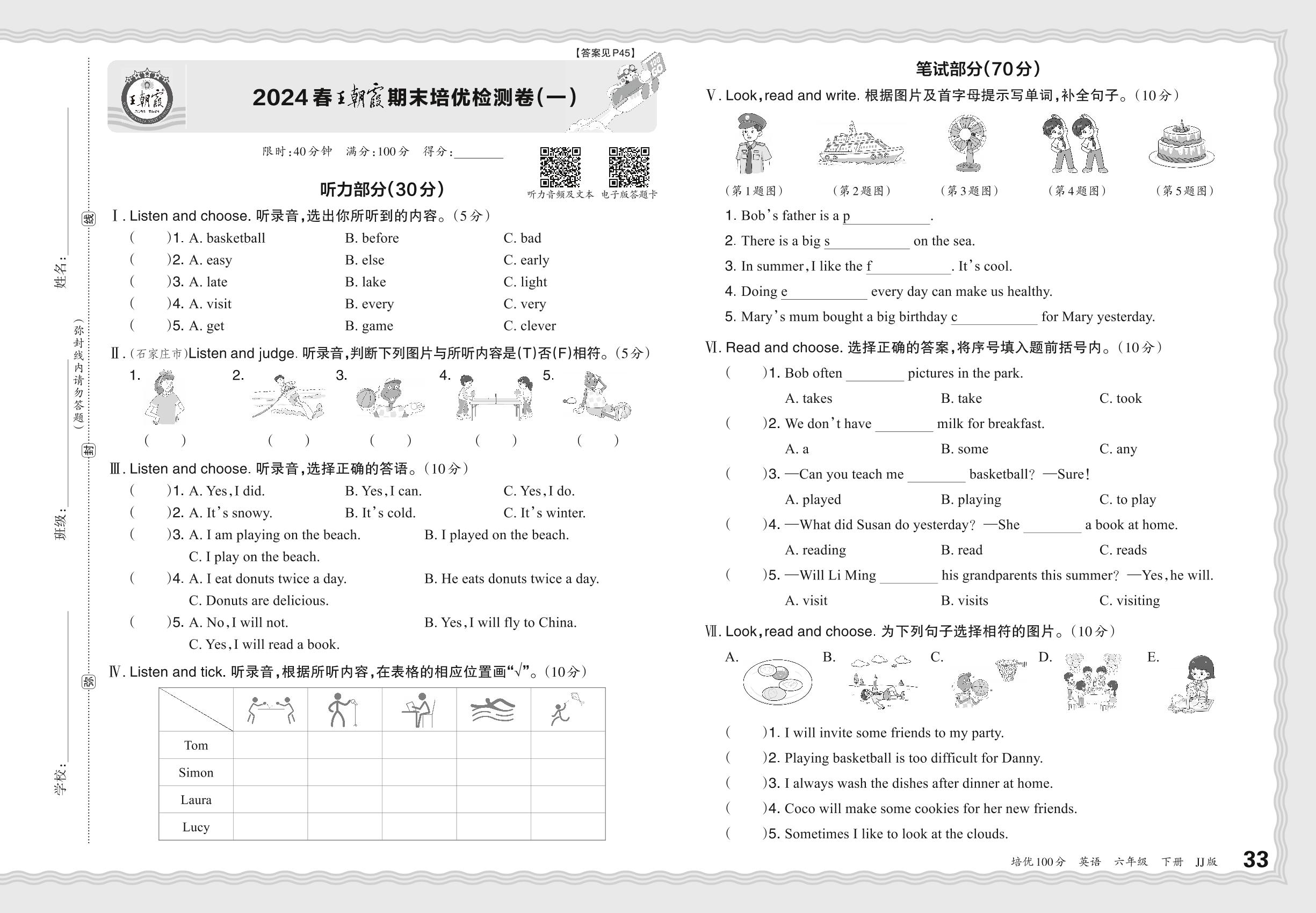 2024春下册六年级英语冀教版 王朝霞期末培优检测卷(一)