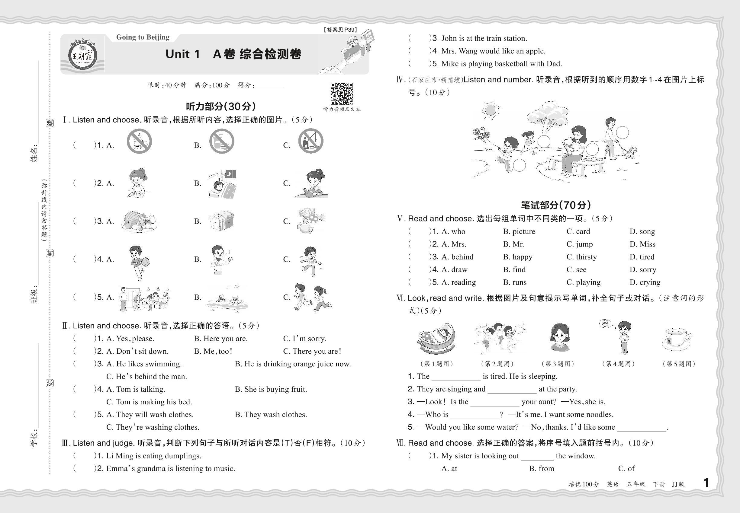 2024春下册五年级英语冀教版 Unit 1 A卷 综合检测卷