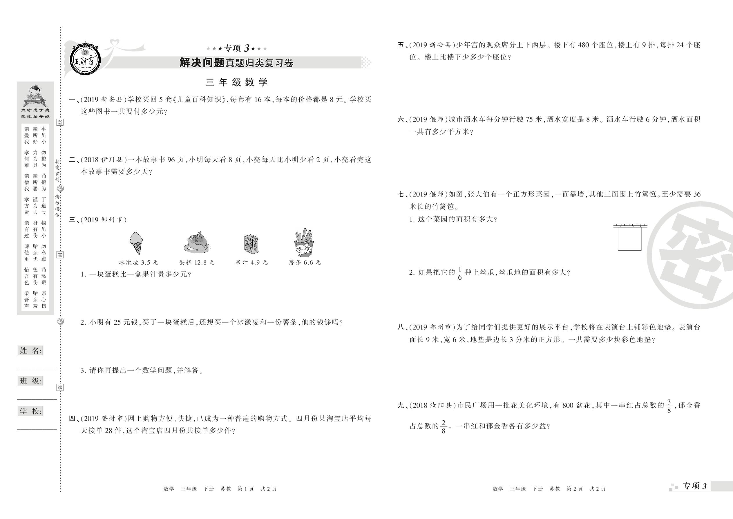 王朝霞期末专项卷——解决问题真题归类复习卷、新颖题速递:生活与数学三年级下册数学(苏教版)_R21080493718【0】