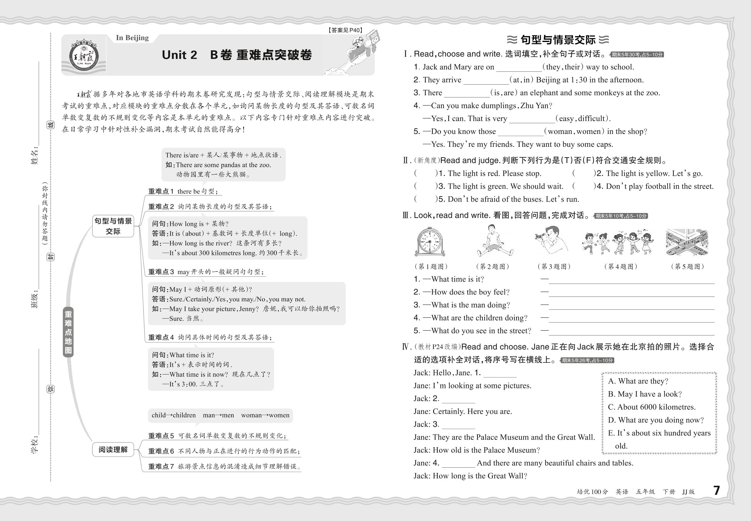 2024春下册五年级英语冀教版 Unit 2 B卷 重难点突破卷