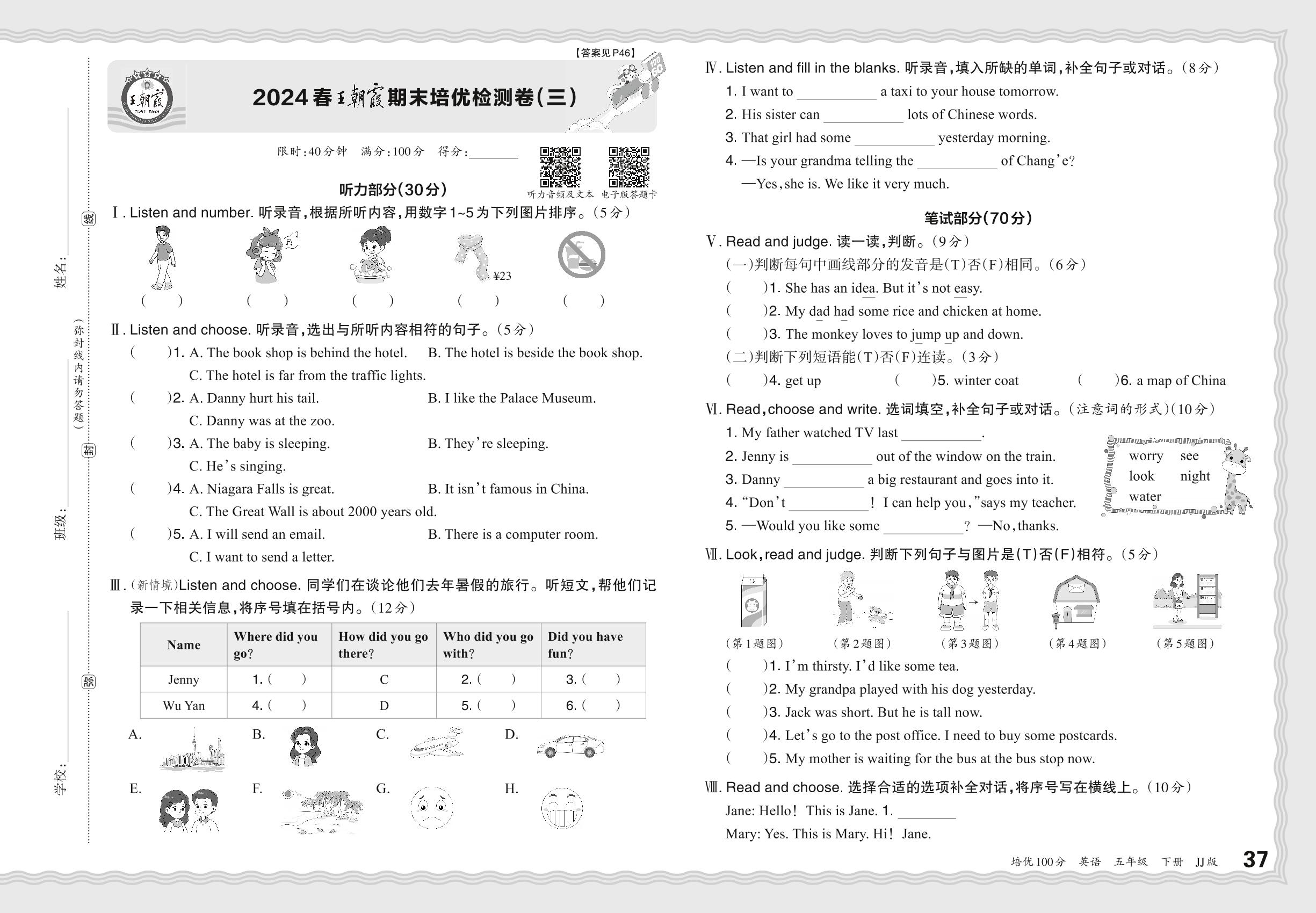 2024春下册五年级英语冀教版 王朝霞期末培优检测卷(三)